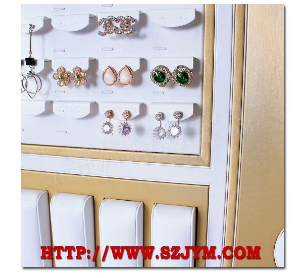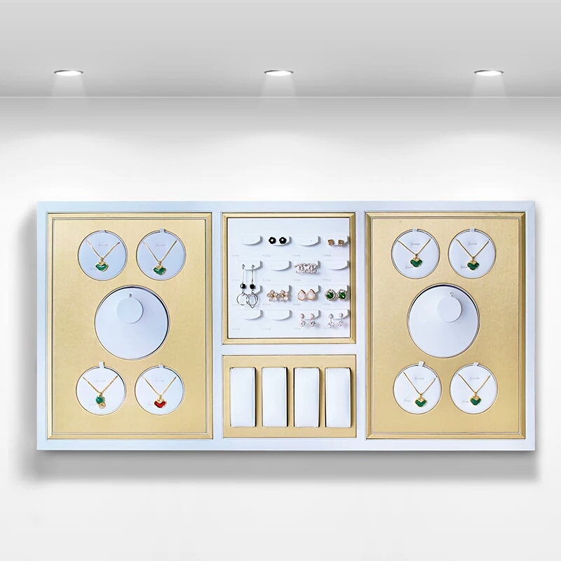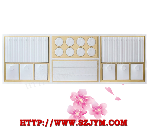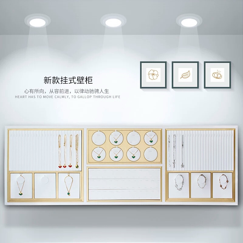 新款挂式壁柜,专为珠宝陈列设计,采用简约现代风格,金色边框搭配白色内衬,层次分明。可灵活展示项链、耳环、戒指等多类饰品,兼具美观与实用性,适用于精品店、商场专柜,提升空间格调与商品吸引力。 English Product Description The new wall-mounted display cabinet TP06 is designed for jewelry presentation, featuring a minimalist modern style with gold frames and white interiors. It offers organized, multi-tiered display for necklaces, earrings, and rings, combining aesthetics with functionality. Ideal for boutiques and retail counters, it enhances spatial elegance and product visibility.