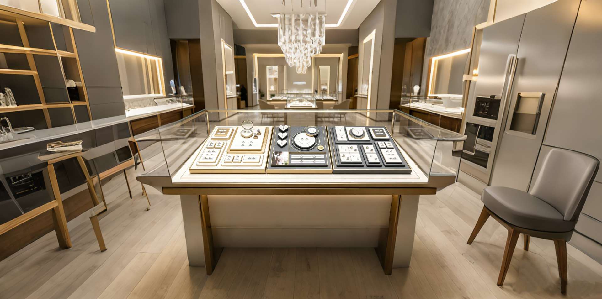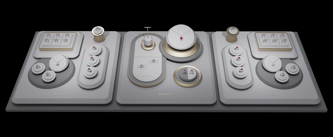 极简风珠宝陈列、高级灰展示台、轻奢珠宝道具、三联式陈列架、戒指耳饰展示座、专柜级陈列、品牌LOGO定制