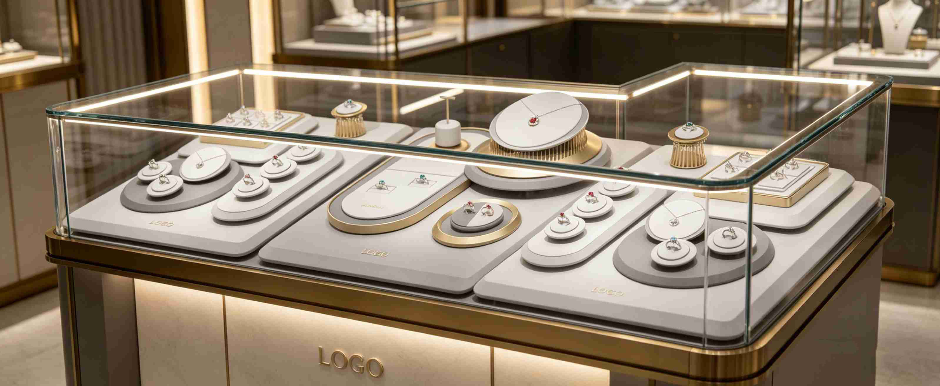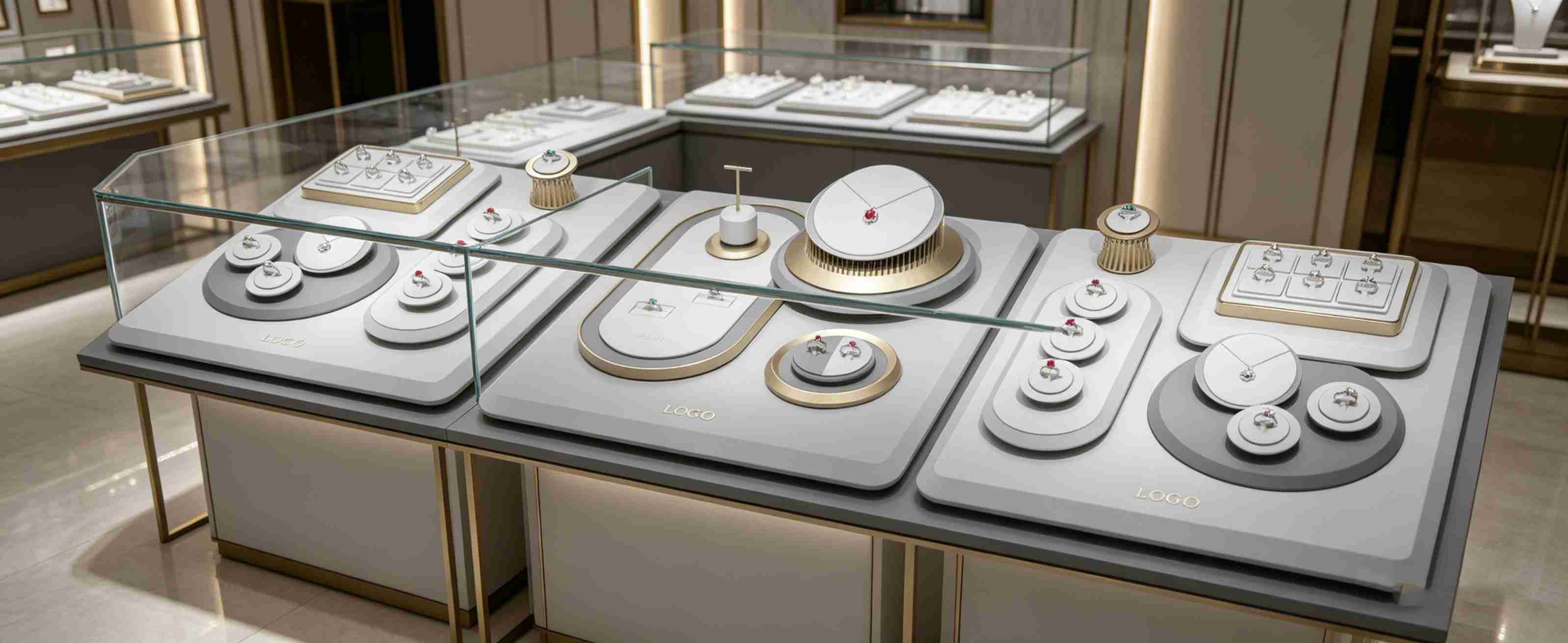极简风珠宝陈列天花板来了!这套三联式展示台,以高级灰+香槟金为主调,搭配圆形、椭圆形几何模块,简约中透着轻奢质感。每个区域精准划分——戒指、耳饰、项链各得其所,还有品牌LOGO位,轻松打造专柜级陈列效果。无论是日常通勤款还是轻奢设计款,摆上去瞬间提升精致感,让顾客一眼锁定心动款!