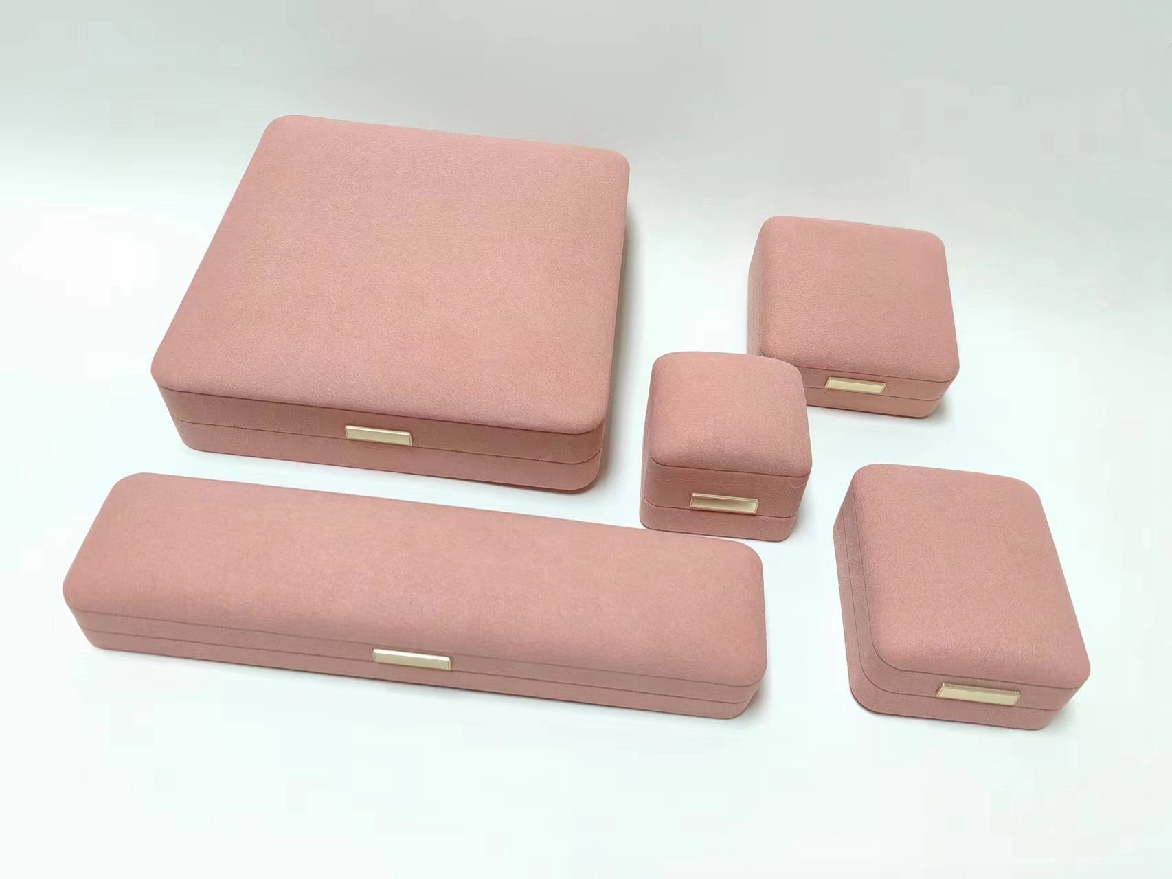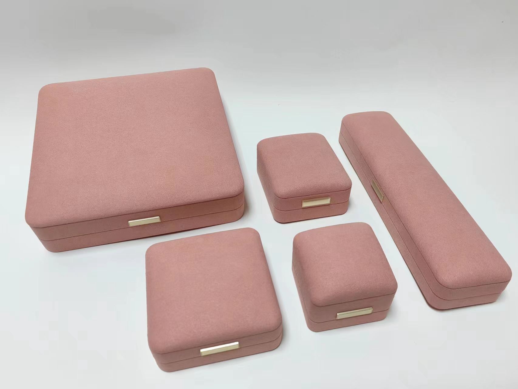 高级感粉色超纤首饰盒套装 《支持定制》 这套高级感粉色超纤首饰盒套装,以柔和的莫兰迪粉色调搭配细腻绒面材质,尽显温柔优雅气质。包含五种不同规格,从戒指、耳钉到项链、手镯,满足各类珠宝的收纳与展示需求。内衬采用亲肤绒布,有效防止饰品刮花,金属铭牌点缀更显精致。无论是作为婚嫁礼盒、生日惊喜,还是自用收纳,都能完美承载珍贵情感,是提升生活仪式感的理想之选。