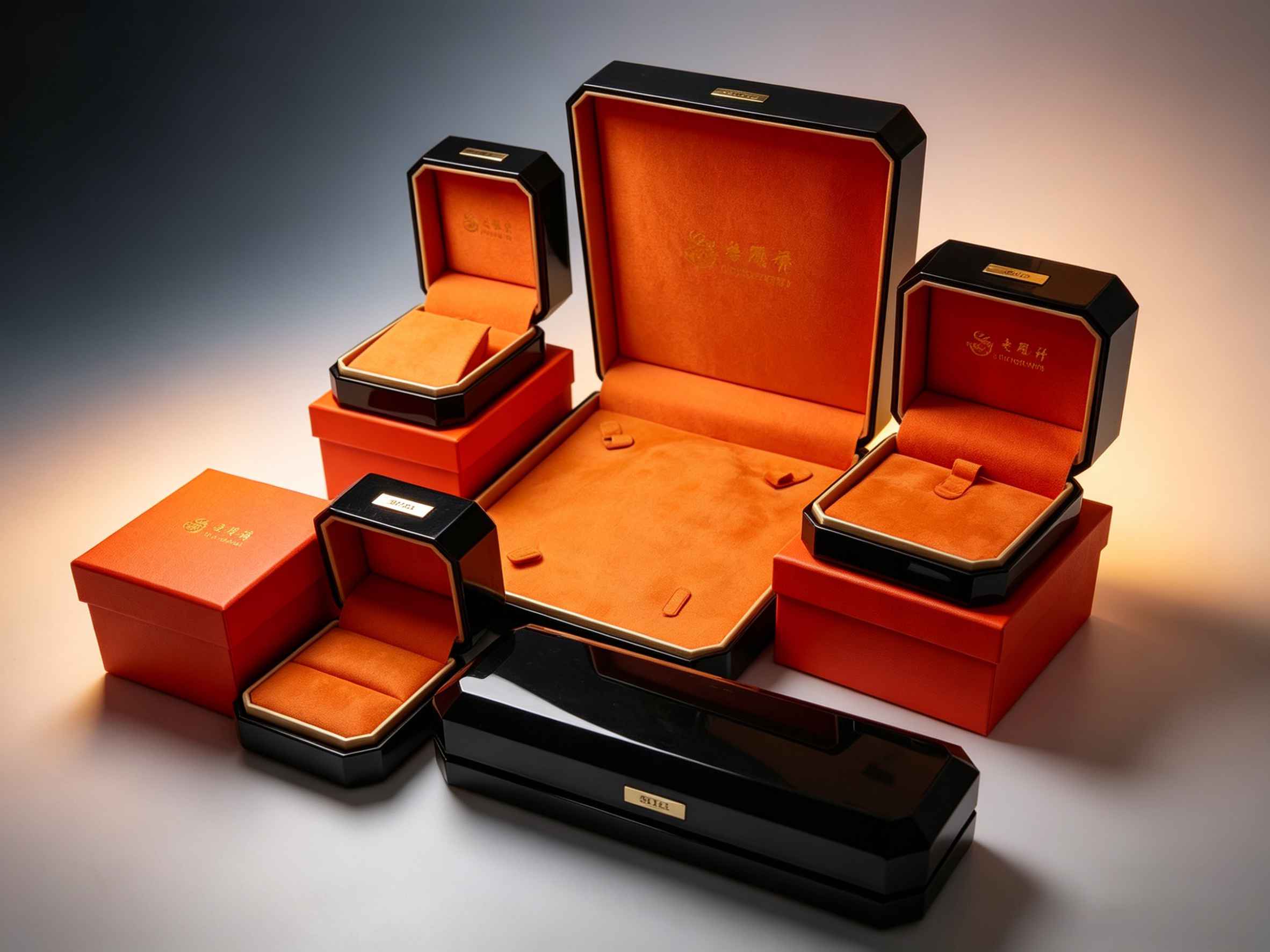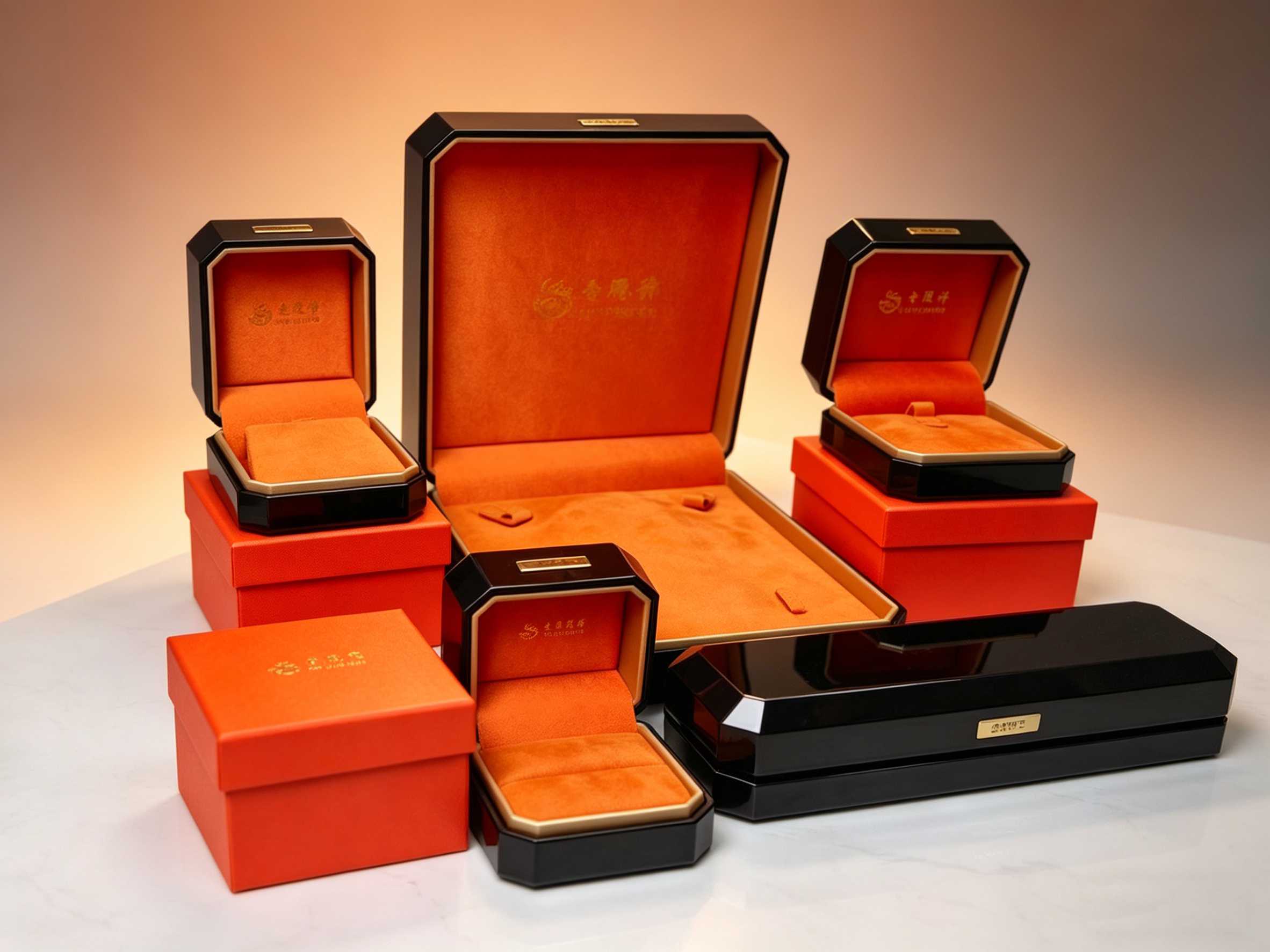 高端黑漆+橙绒系列首饰盒,采用高光钢琴烤漆外壳搭配烫金品牌标识与金色包边,内衬 premium 橙色丝绒,触感细腻防刮。八角/方/长条多形制组合,适配戒指、吊坠、手镯及婚庆套装。结构稳固,磁吸开合静音优雅