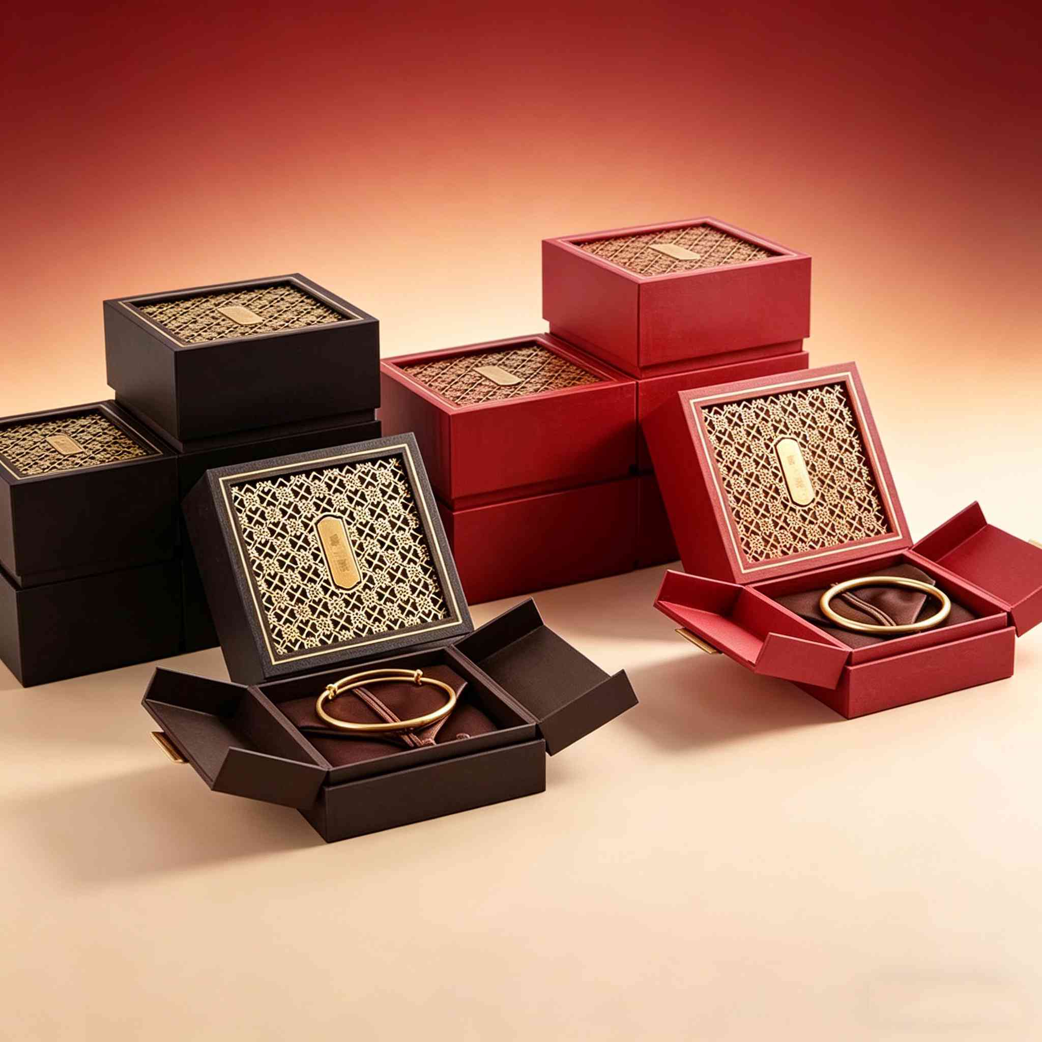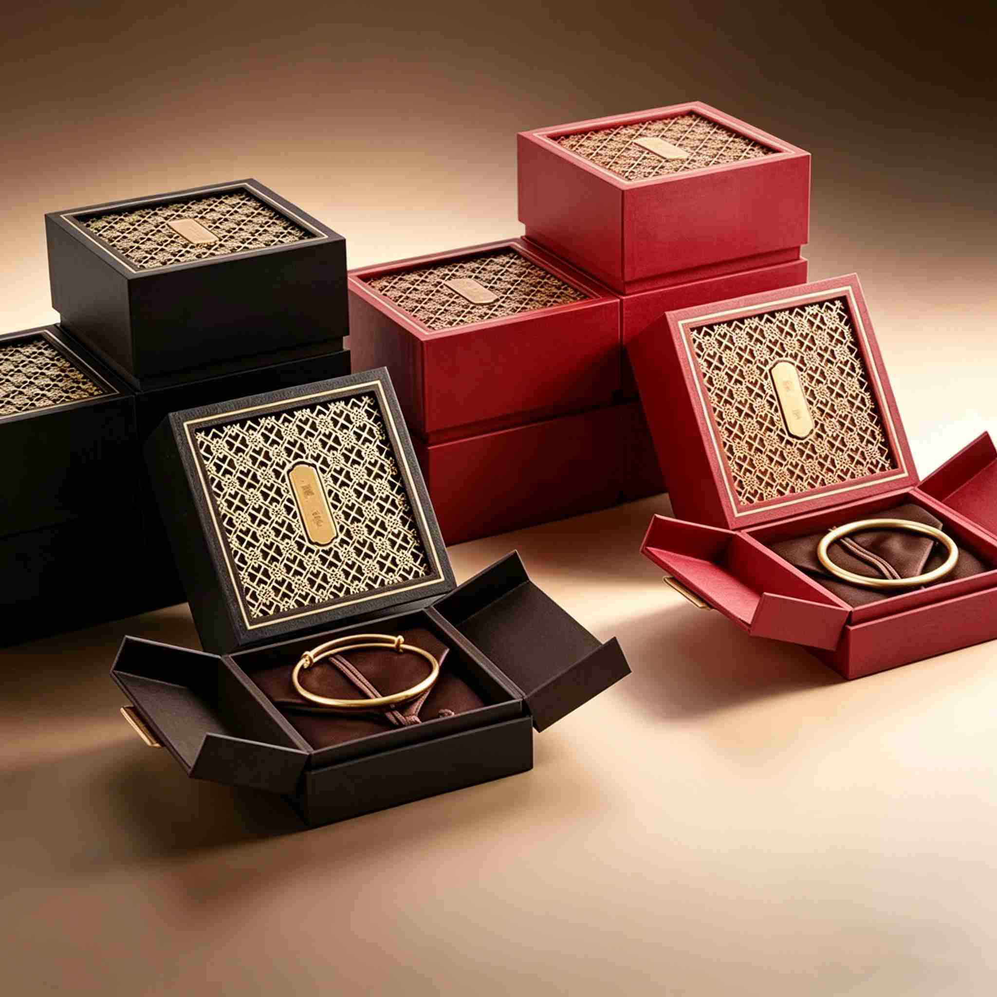 Elegant Chinese-inspired jewelry boxes with laser-cut gold-foil lattice lid (black/red options), magnetic flip-top closure, and embossed brand plaque. Deep brown velvet interior with precision slots for bangles & rings. Ideal for 24K gold, ancient-craft gold, and intangible cultural heritage pieces.