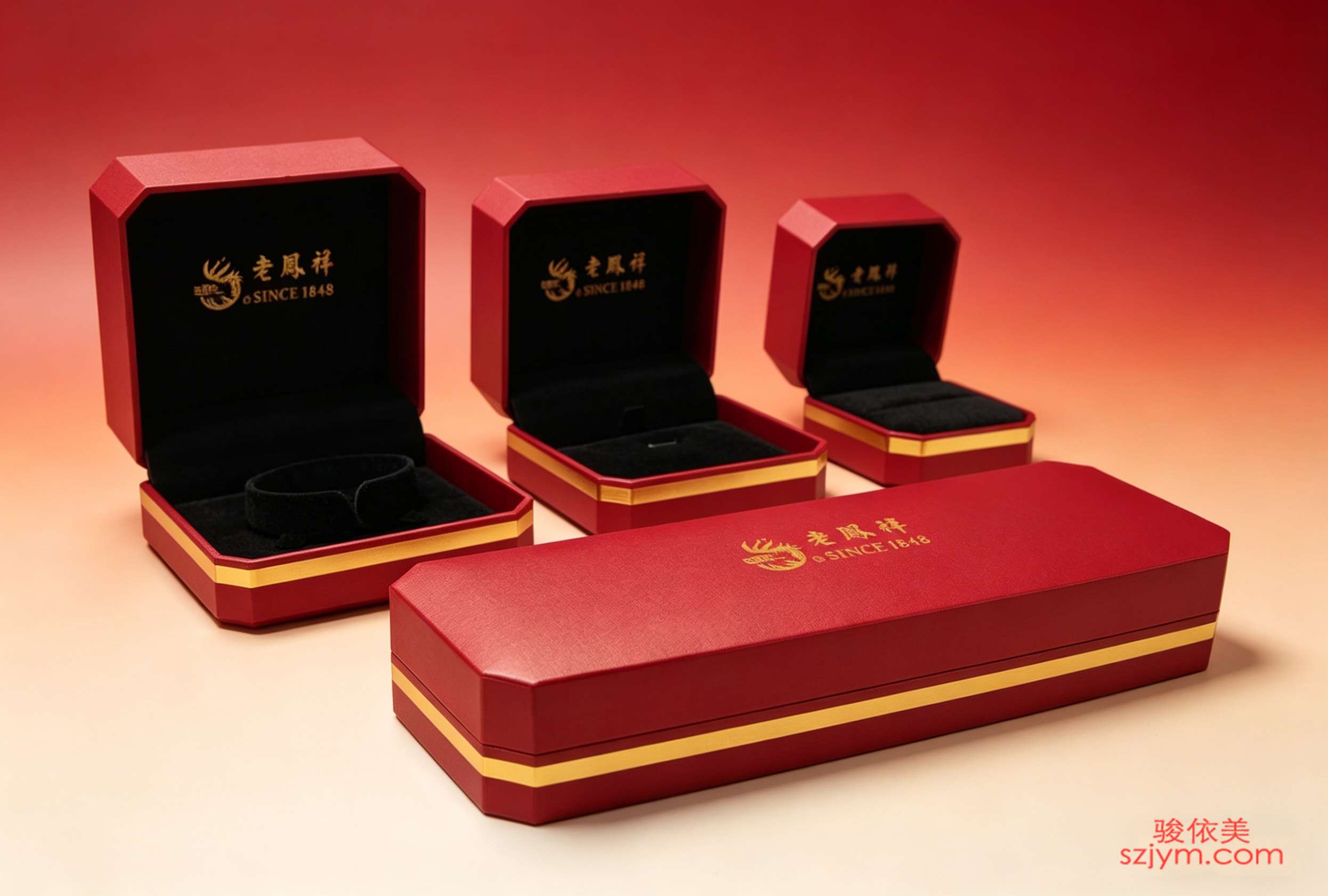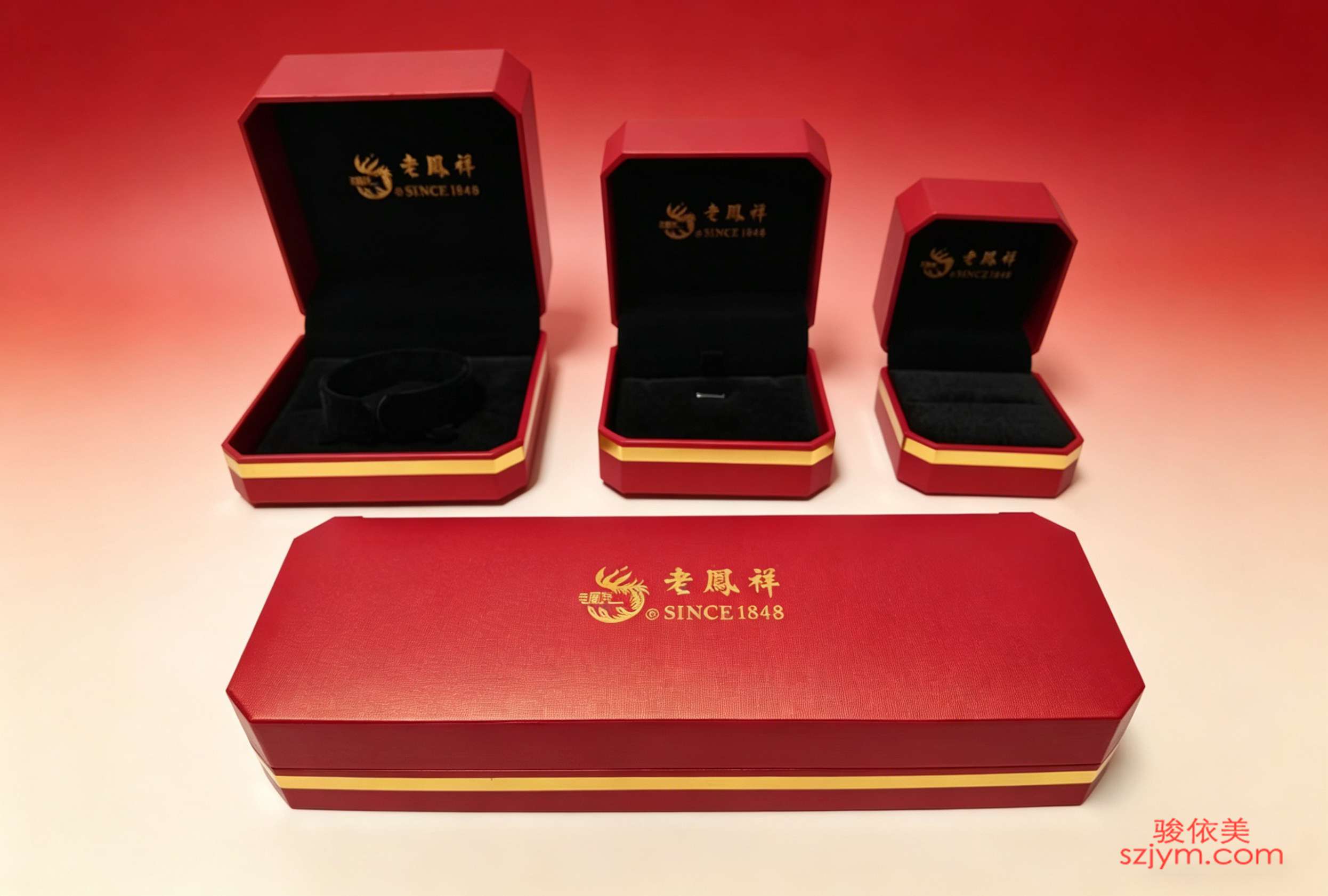 老凤祥珠宝盒、八角形红金礼盒、黑绒内衬卡位、24K烫金龙标、足金三件套包装、中式高端婚庆盒、品牌VI定制、源头厂家直供