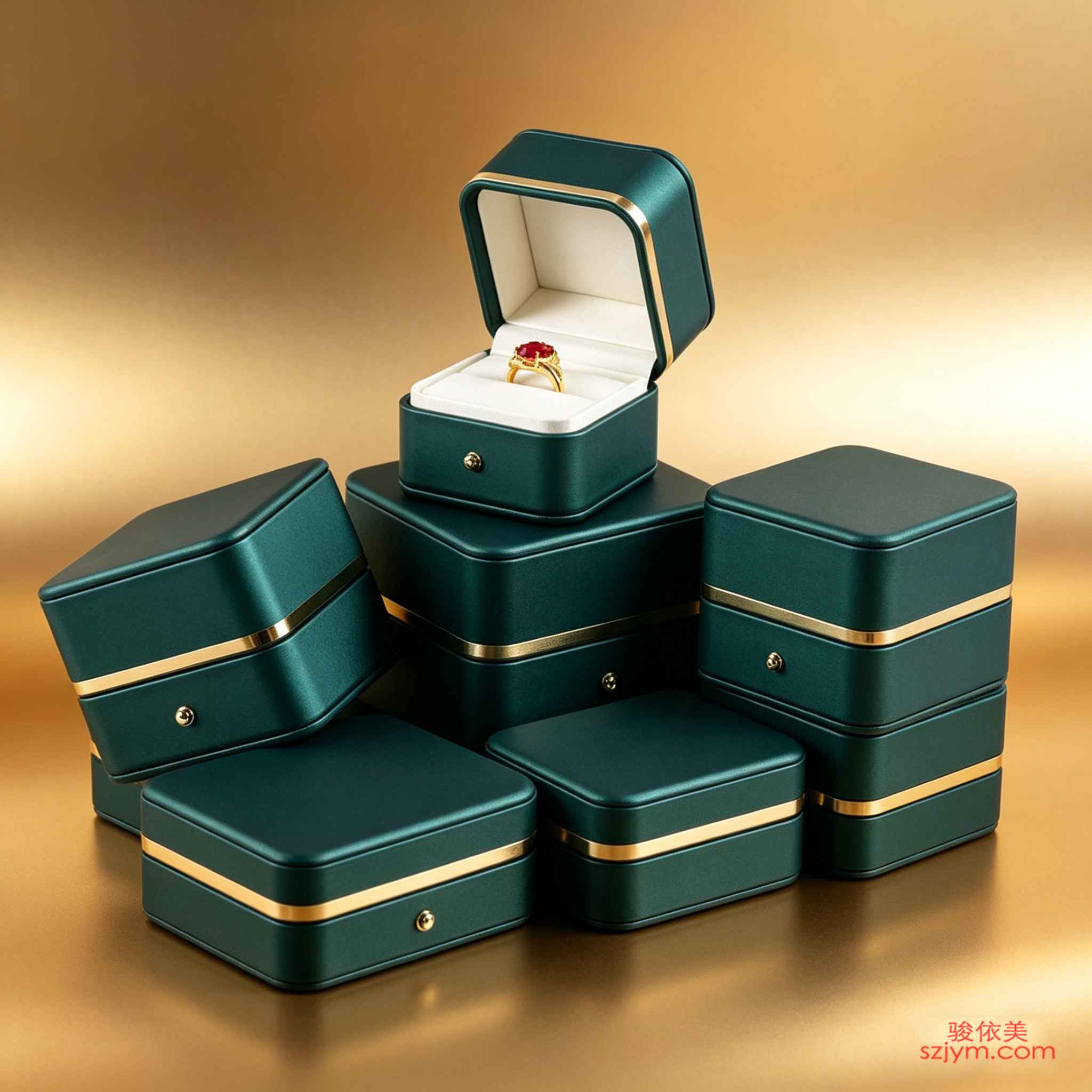 墨绿PU皮珠宝盒、镀金饰条磁吸盒、丝绒内衬卡位、彩色宝石包装、轻奢品牌定制、长方体礼盒、翻盖式戒指盒、源头工厂批发