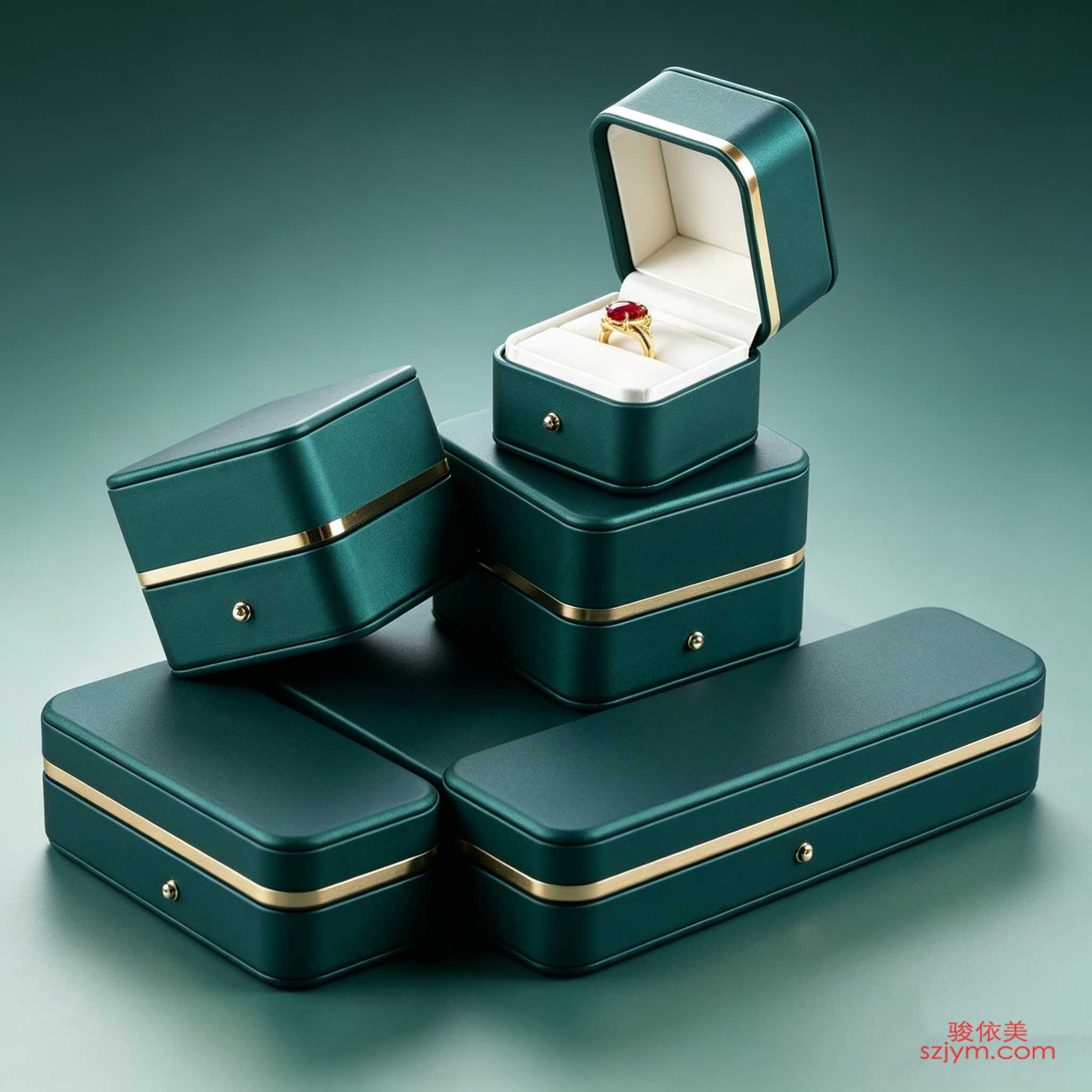 墨绿色哑光PU皮质珠宝盒系列,配24K镀金饰条与磁吸扣,内衬米白丝绒+定制凹槽,开盖即显高级感。方盒、长盒、翻盖式三款组合,专为红宝石、祖母绿等彩色宝石戒指/吊坠设计。轻奢小众品牌首选,支持烫金LOGO与内托定制