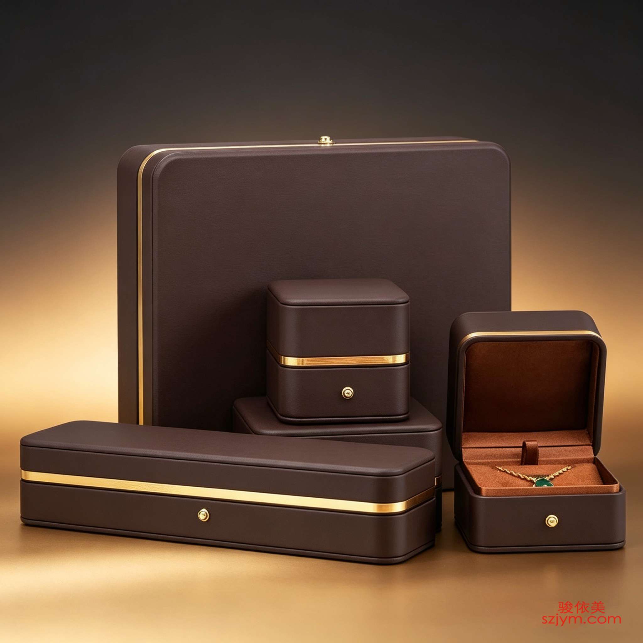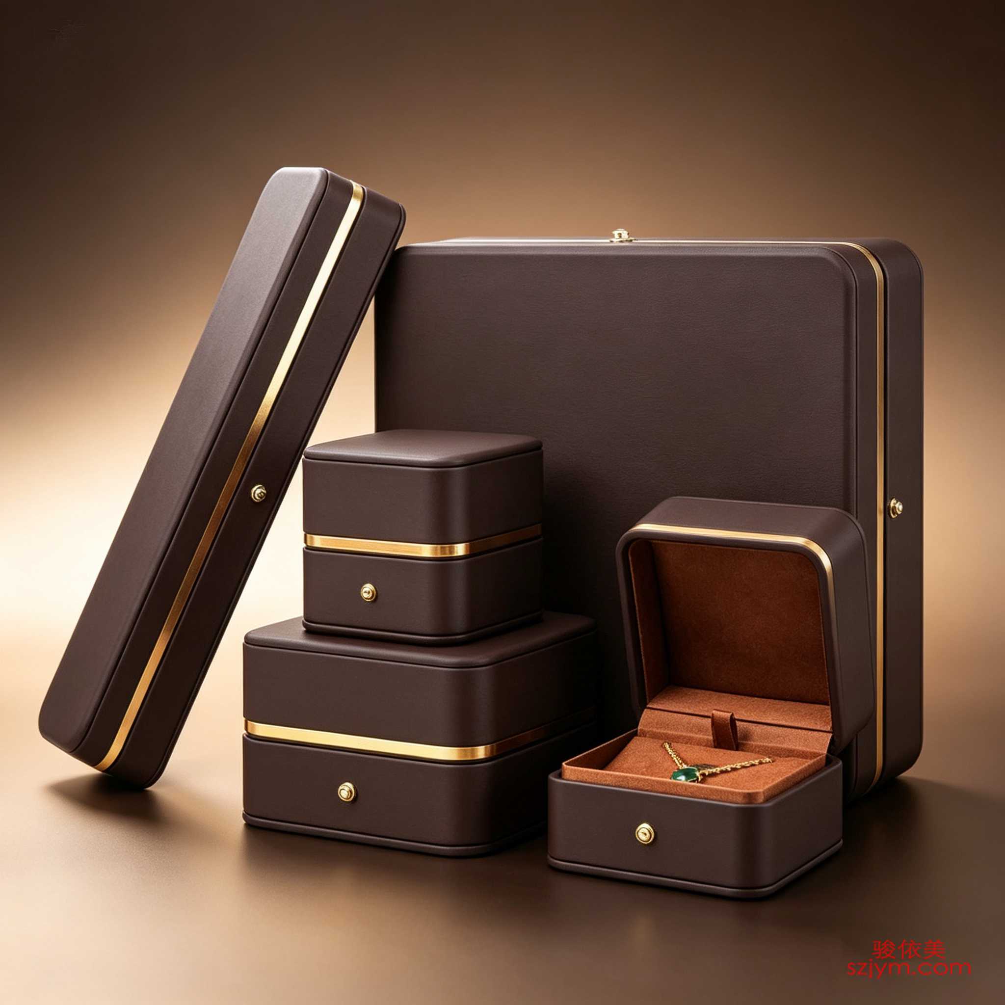 深咖PU皮珠宝盒、镀金饰条磁吸盒、暖棕丝绒内衬、多件套组合包装、轻奢品牌定制、长条形项链盒、翻盖式戒指盒、源头OEM工厂