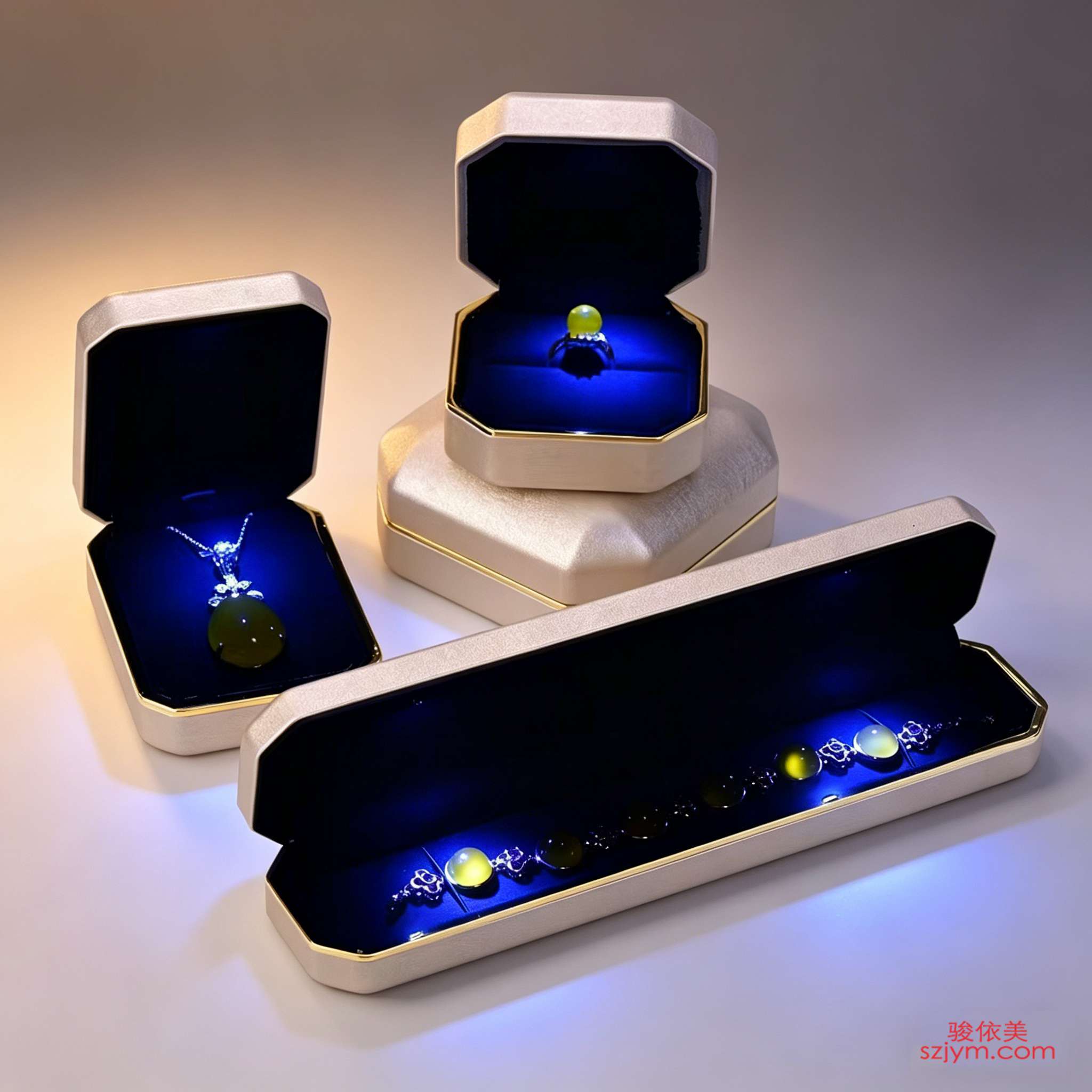 香槟金八角礼盒|LED蓝光珠宝盒|磁吸静音开盒|深蓝丝绒内衬|多格戒指收纳盒|玉石专用包装|品牌首发礼盒|可调光定制盒