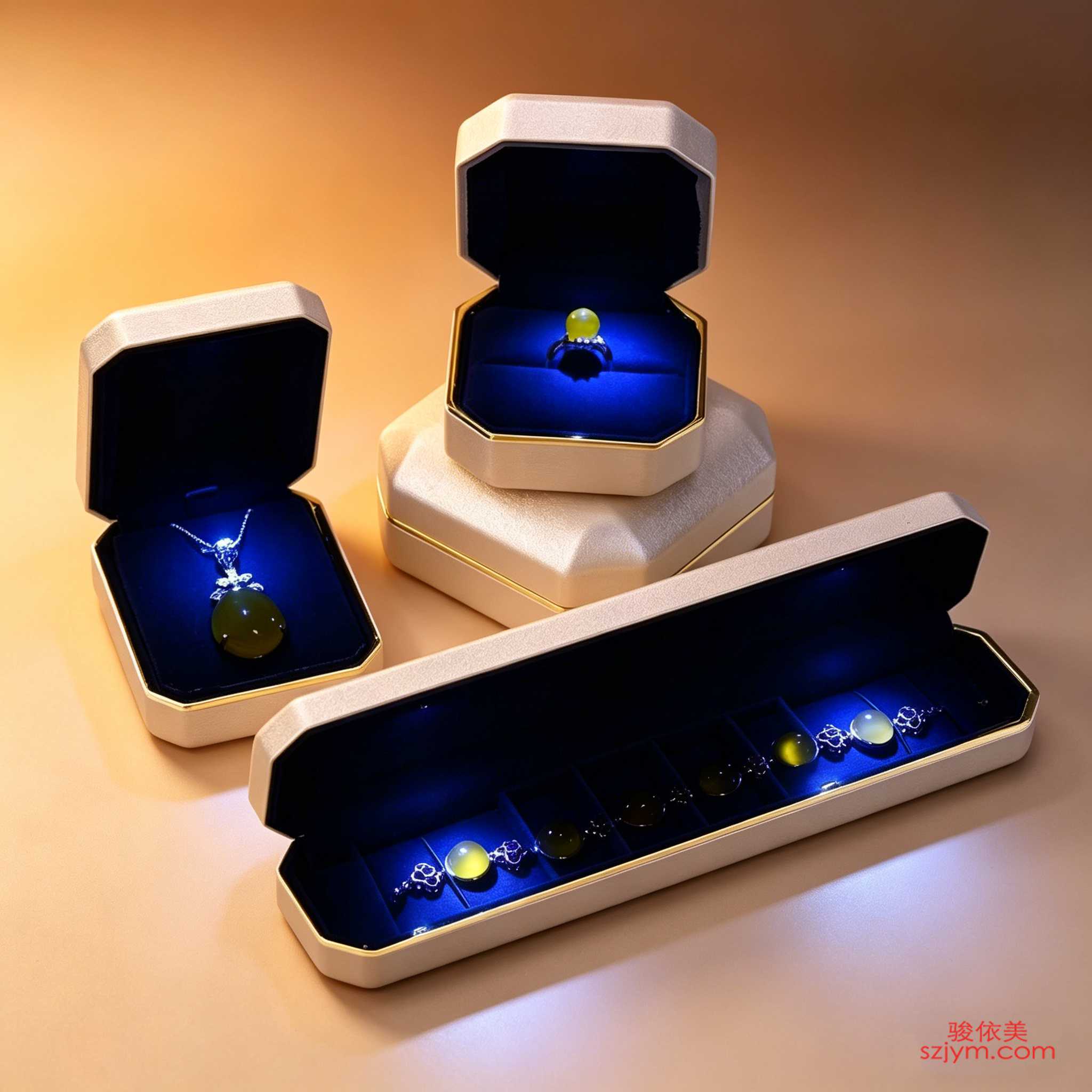 香槟金硬质纸盒三件套,八角造型+内嵌LED蓝光灯效,开盖即亮,衬托珠宝温润光泽;内衬深蓝丝绒+精准植绒卡位,防刮防滑。含单戒盒、吊坠盒与多格手链/戒指长盒,结构坚固,磁吸静音开合。专为高端玉石、轻奢银饰及品牌首发礼盒设计,支持烫金LOGO、定制内托与灯光时长调节,仪式感拉满,赠礼首选。