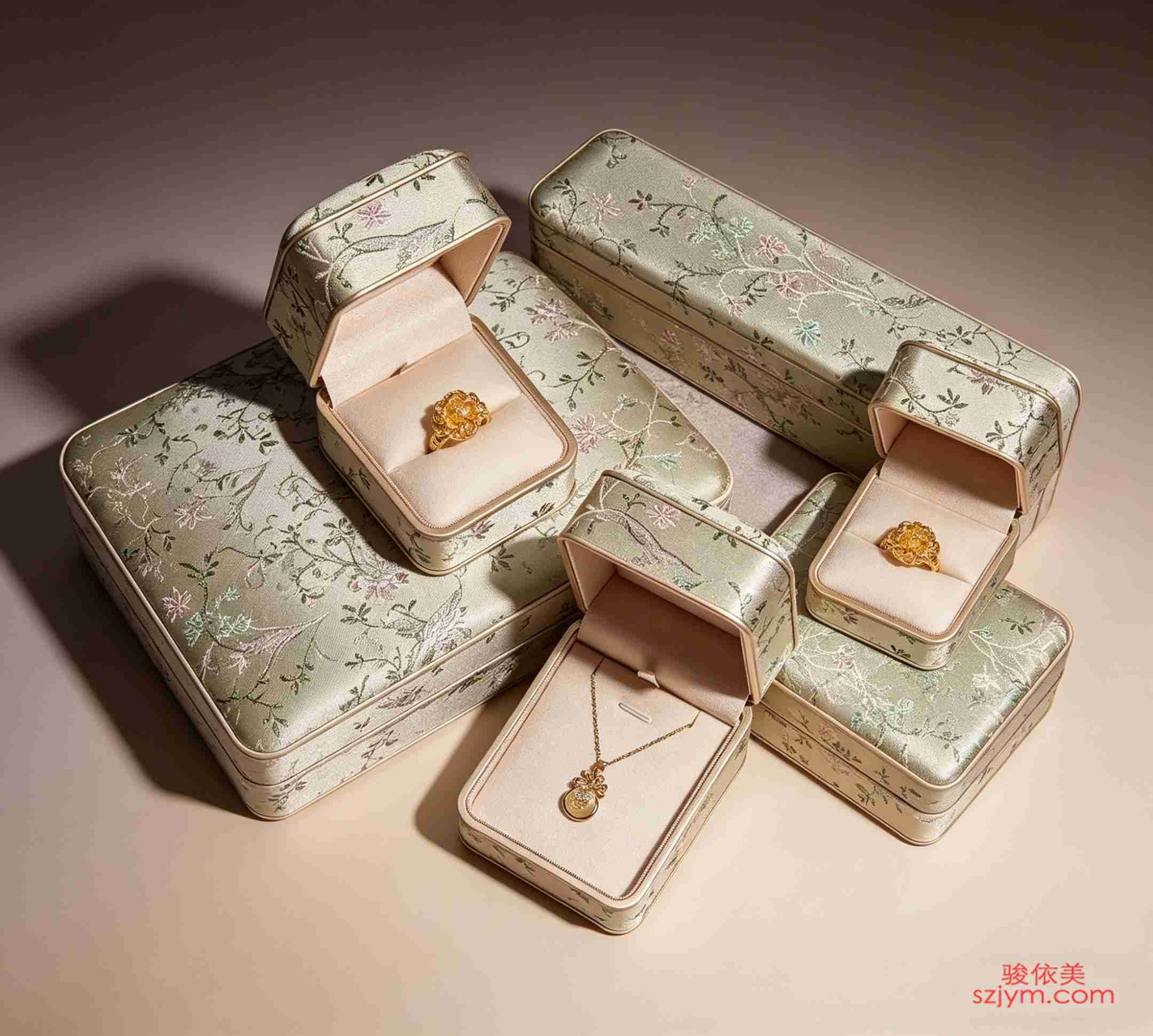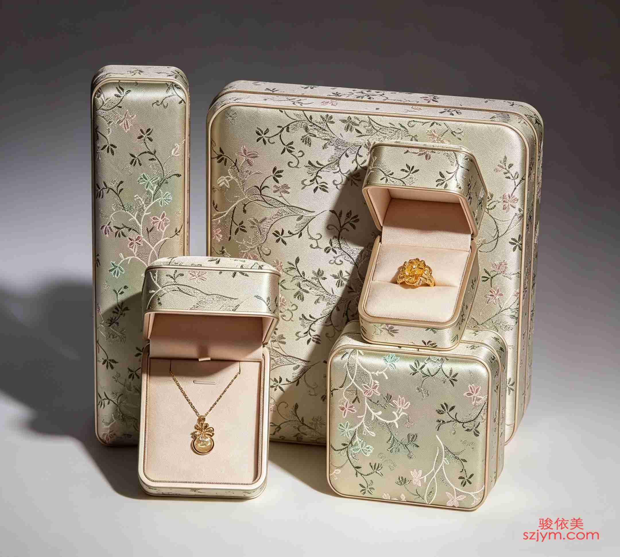 米金底色提花织锦珠宝盒五件套,以素雅灰绿枝蔓与淡彩花卉为纹样,融合宋韵美学与现代轻奢;外层高密度硬质纸覆真丝感提花面料,内衬柔雾粉金丝绒+精准卡位。含长条项链盒、大号套装盒、单戒盒、吊坠盒及方型收纳盒,磁吸静音开合,边角包金加固。专为新中式珠宝、高端伴手礼及品牌限量系列定制,支持烫金/刺绣LOGO与内托模塑。
