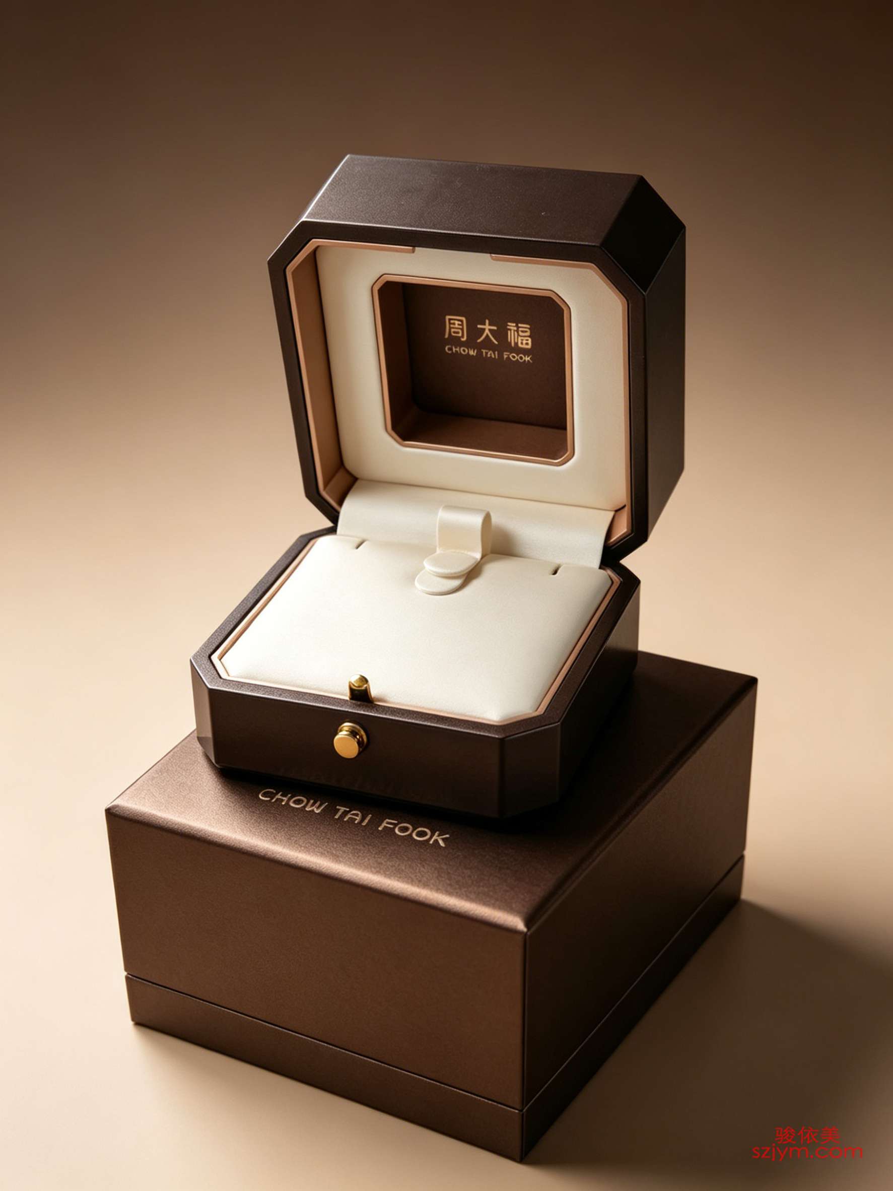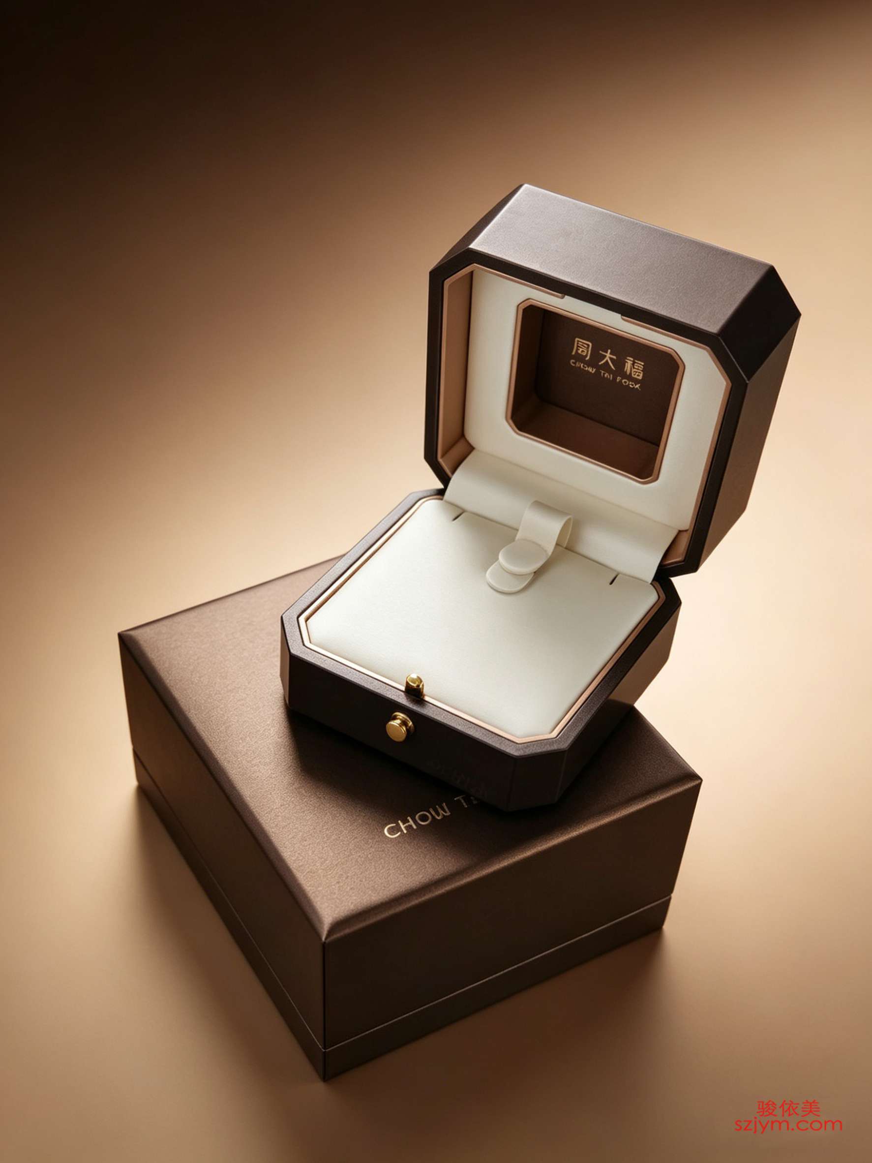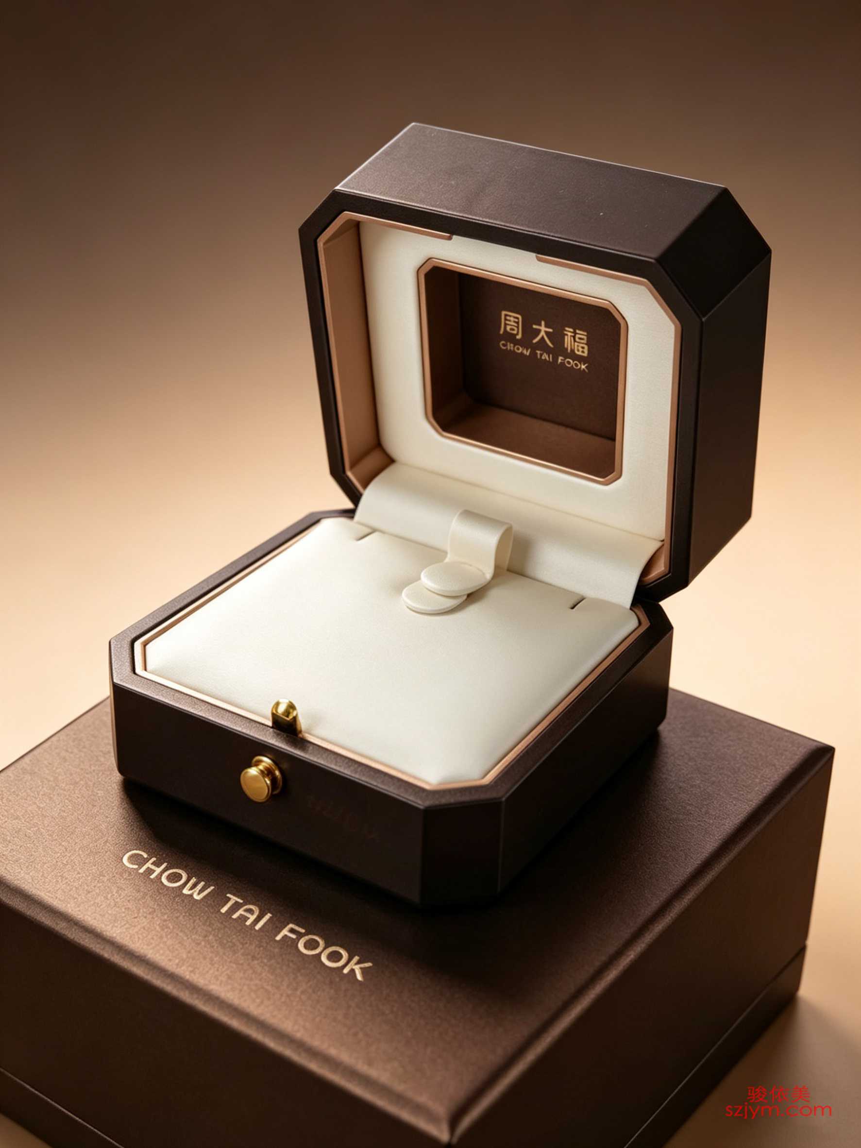 八角婚戒礼盒|深咖哑光皮感盒|米白皮革内衬|玫瑰金包边磁吸盒|周大福烫金标识|可翻折托架设计|激光雕刻定制|VIP专属礼盒