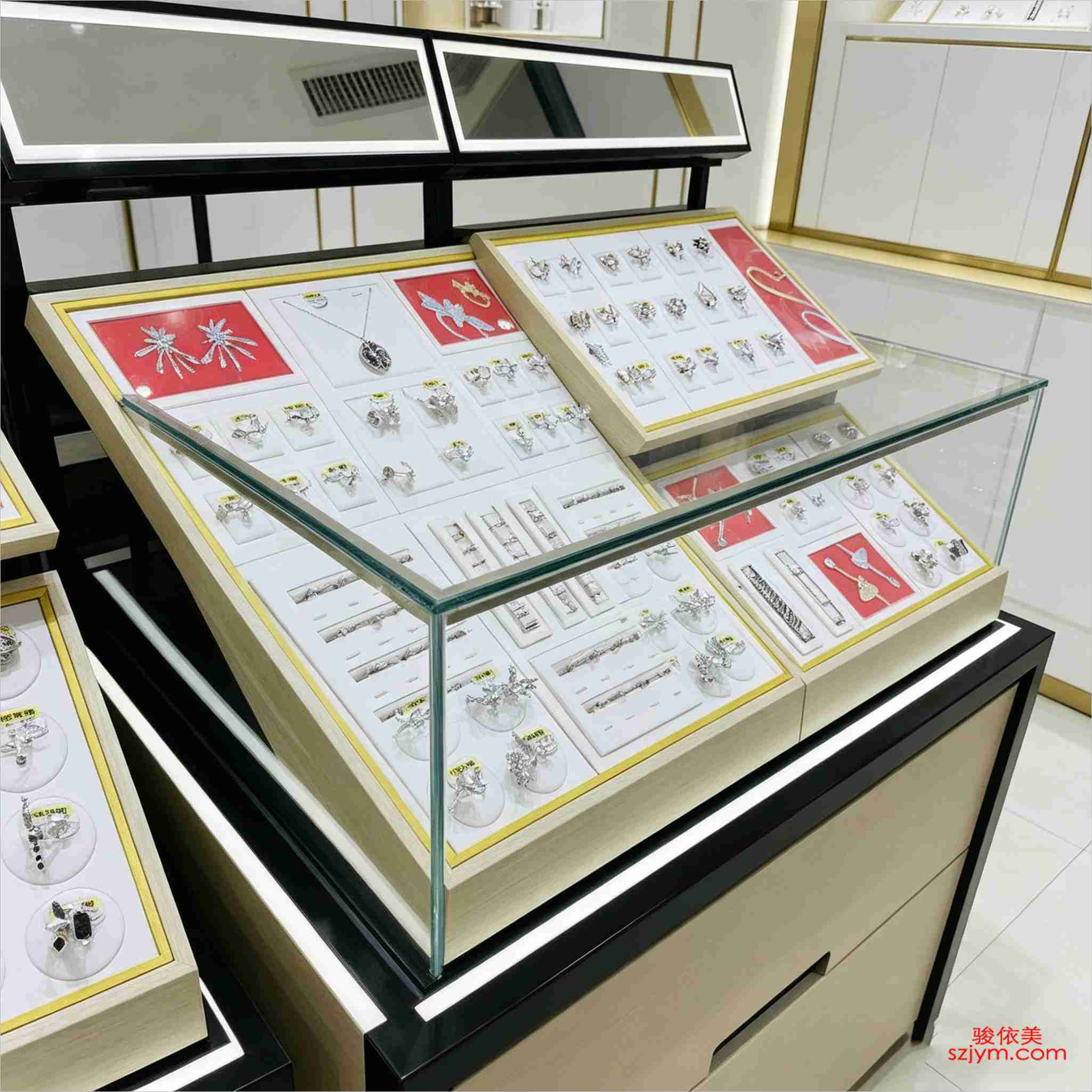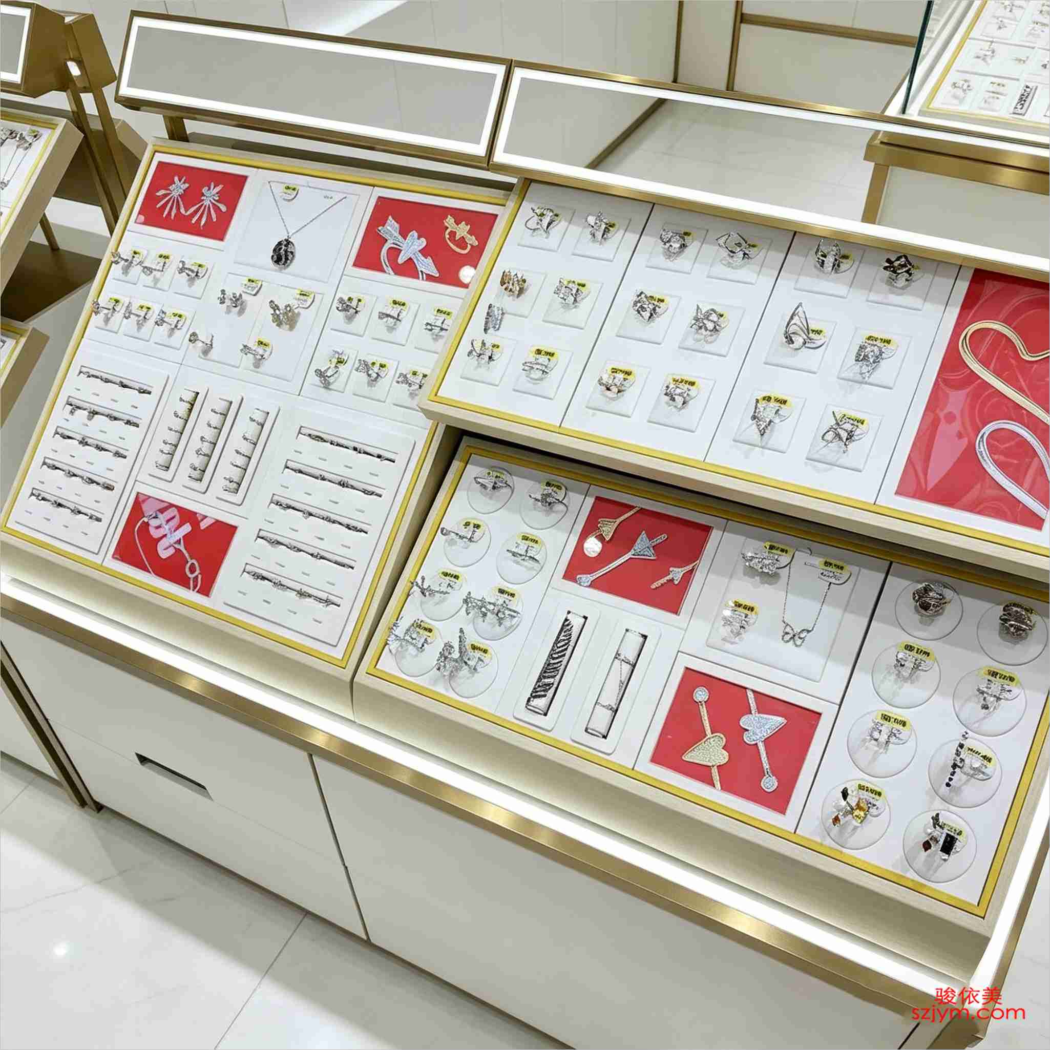 香槟金中岛珠宝展柜 可拆卸亚克力分格托盘 嵌入式画框背景墙