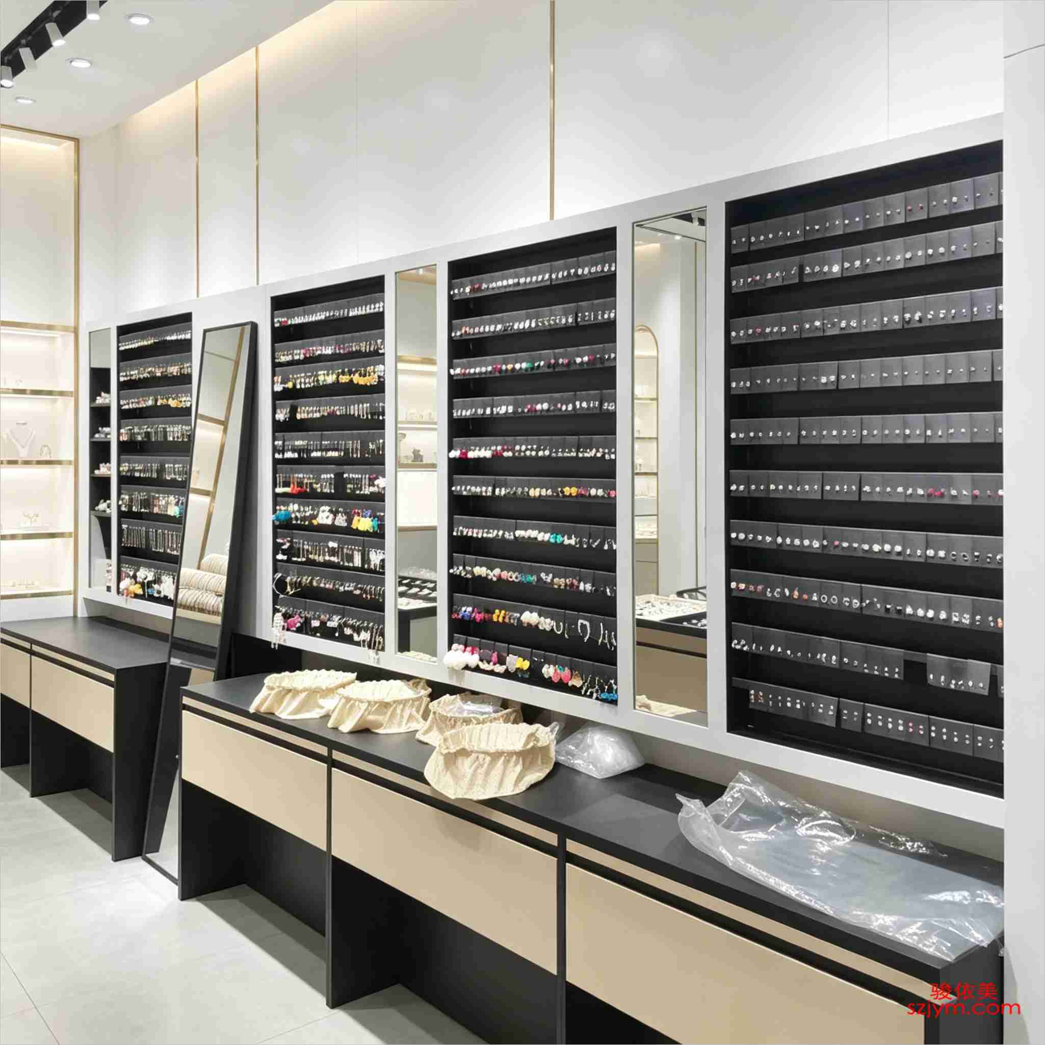 现代极简风格耳饰/戒指墙式陈列系统,采用哑光黑亚克力背板+银灰金属框架,内置多层可调式插槽托盘,密集展示千余款耳钉、耳环与戒指;镜面分隔设计增强空间纵深感,搭配米白柜台与玻璃展柜形成层次动线。适用于快时尚珠宝店或集合店高密度SKU陈列,提升选品效率与视觉丰富度,兼顾整洁性与爆发式陈列效果。