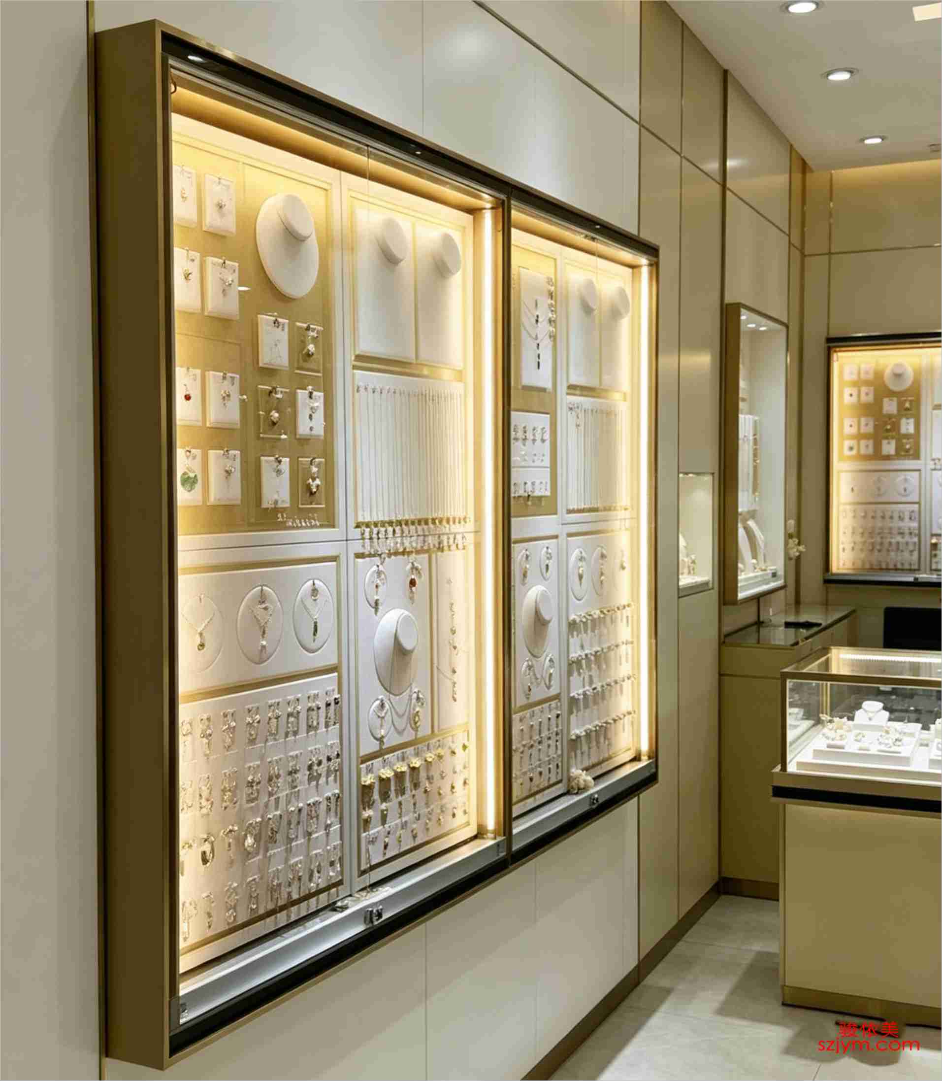 高端定制嵌入式珠宝橱窗展柜,香槟金边框搭配暖光背光系统,三联模块化设计:左区为方格卡纸+圆形颈托组合展示吊坠与耳饰;中区设双人台颈托+垂直挂杆陈列项链;右区采用密集插槽式耳饰墙。整体采用哑光白亚克力面板与防眩玻璃,兼顾通透性与防尘性,适用于轻奢品牌旗舰店核心视觉面,强化系列感与精致陈列逻辑。
