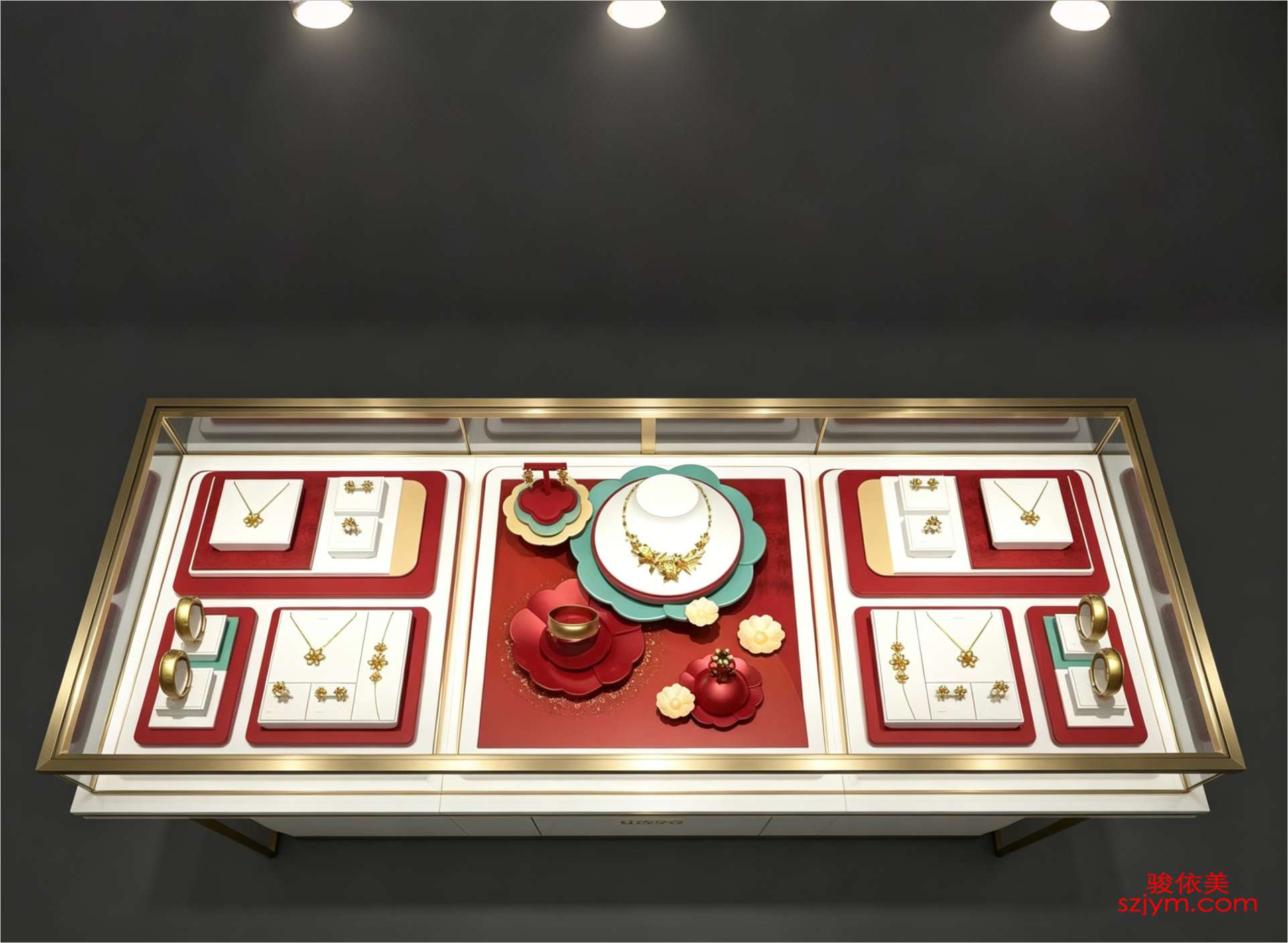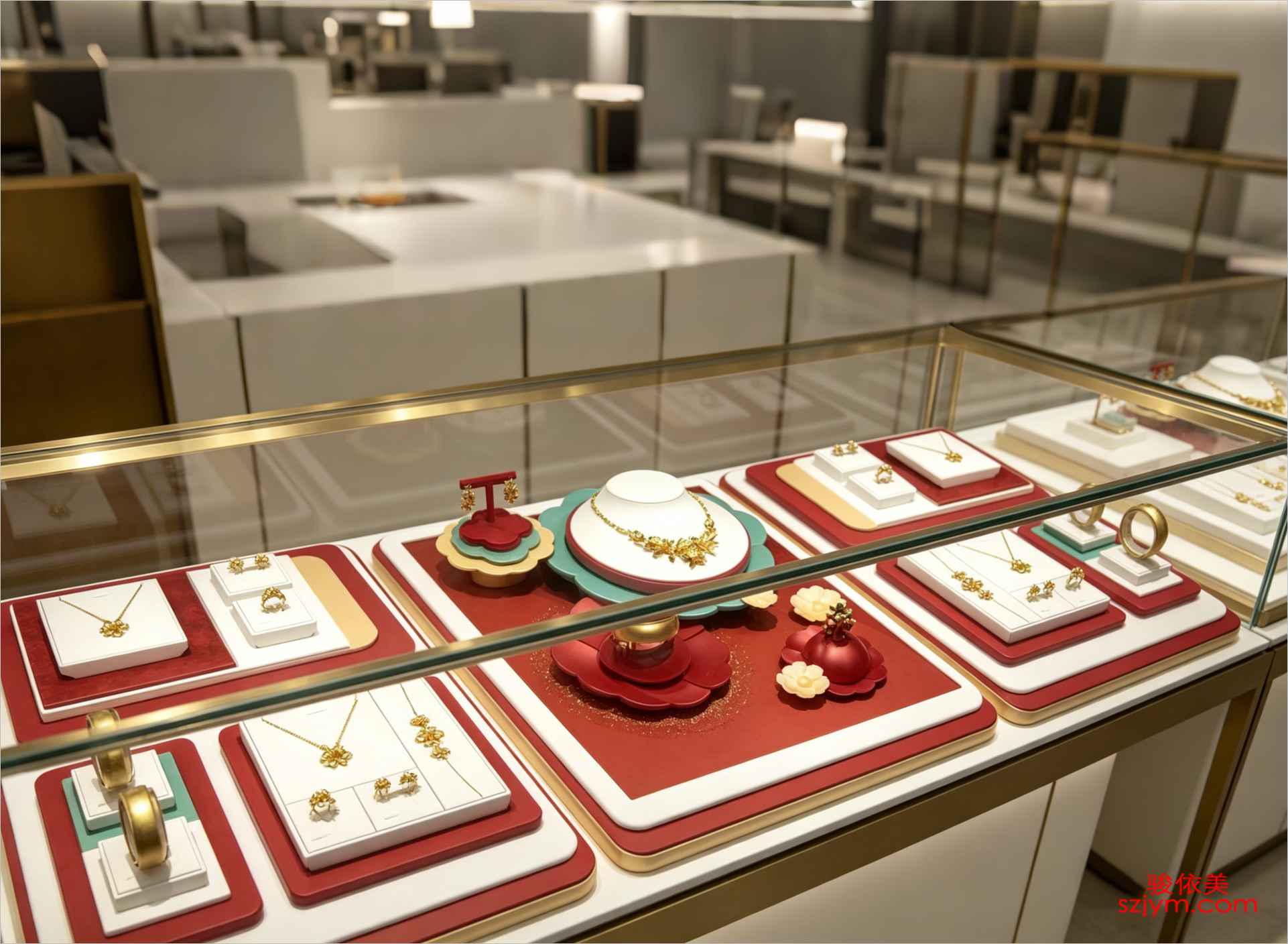 骏依美首打造节日主题珠宝陈列方案,以喜庆红金配色为主调,搭配立体花型托盘、定制内衬卡位、多层组合展台与异形颈托底座,凸显黄金饰品的华贵质感。适用于春节、婚庆等高端场景,提升品牌仪式感与购买欲。