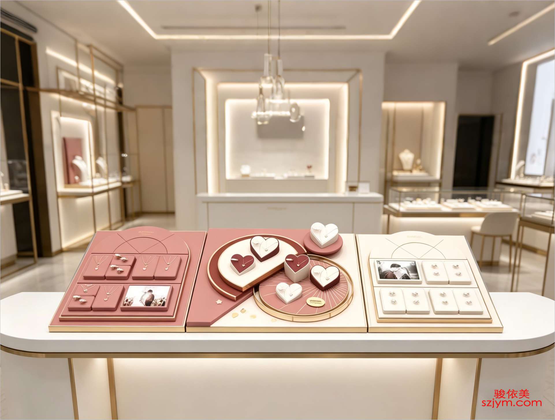 Junyi Meishou’s premium gifting set features a romantic blush-gold palette with emotional storytelling: heart-shaped magnetic boxes, modular multi-compartment trays, photo-inset slots, rotating display turntables, custom gold-foil plaques, velvet linings, and reconfigurable modular structures—designed for couple jewelry, anniversaries, and brand-centric gifting. Combines elegance, functionality, and narrative depth. Keywords: Heart-Shaped Magnetic Box | Multi-Compartment Tray | Photo-Inset Slot | Rotating Display Turntable | Gold-Foil Plaque | Velvet Lining | Modular Structure