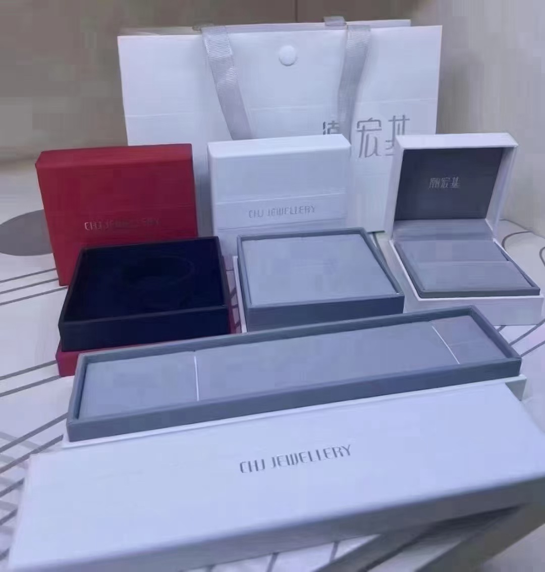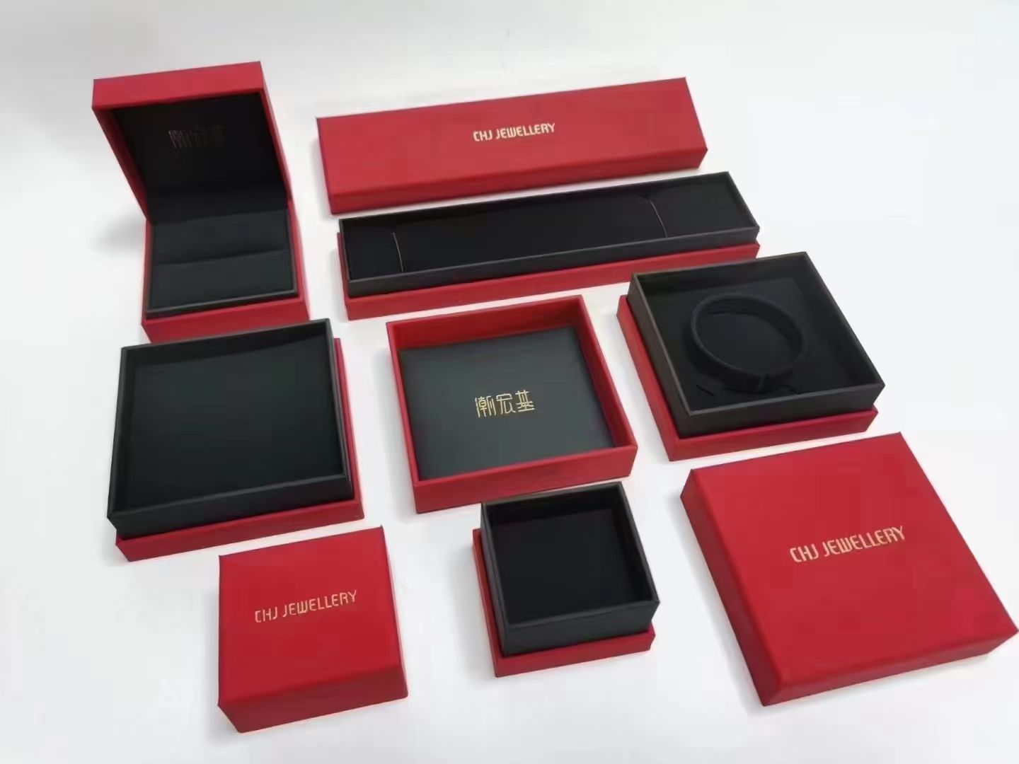 CHJ JEWELLERY 潮宏基珠宝包装盒系列,采用红黑经典配色,材质细腻,工艺精致,包含多种规格,适用于戒指、手镯、吊坠等不同品类,彰显品牌高端质感与礼品属性。