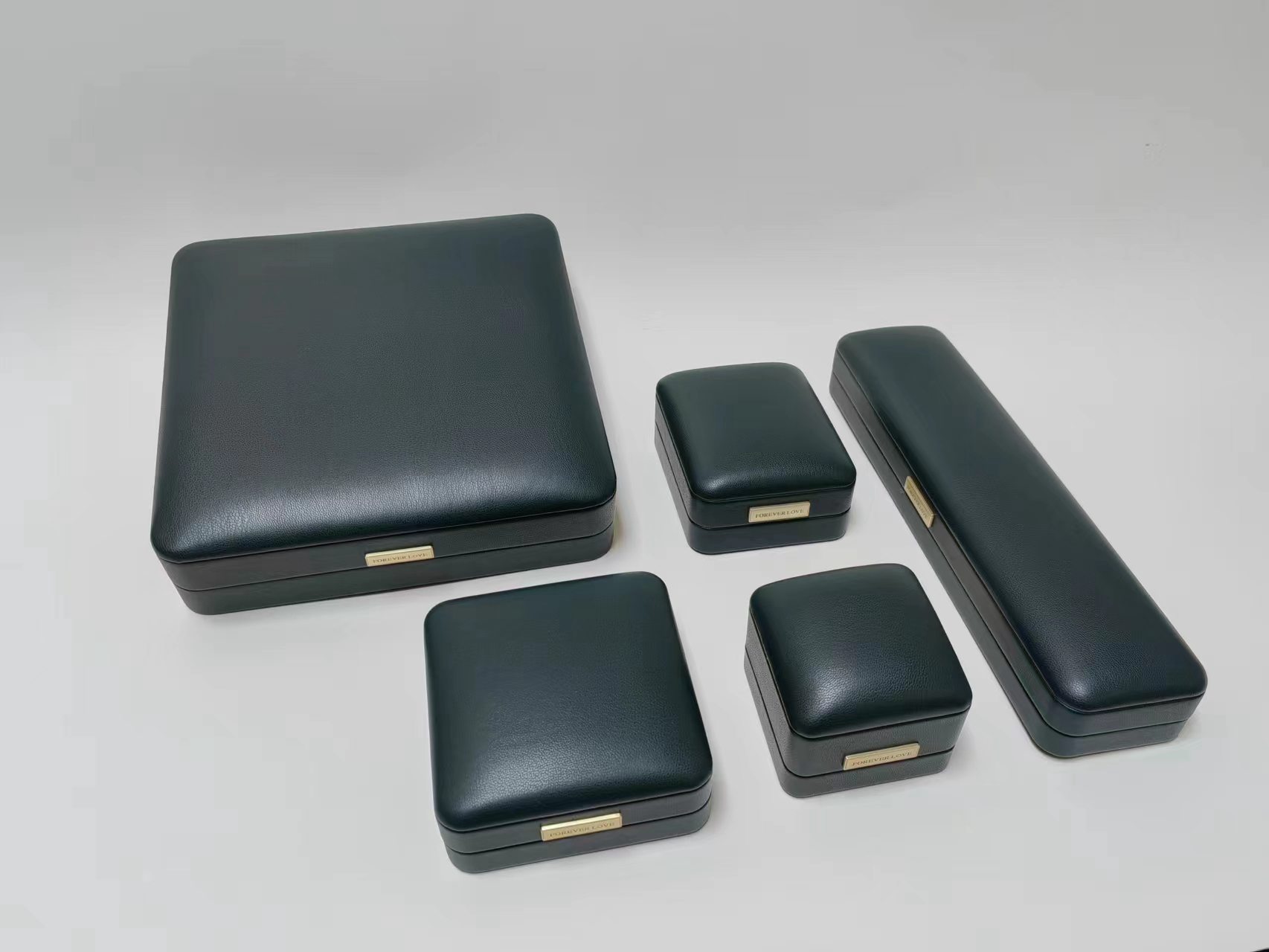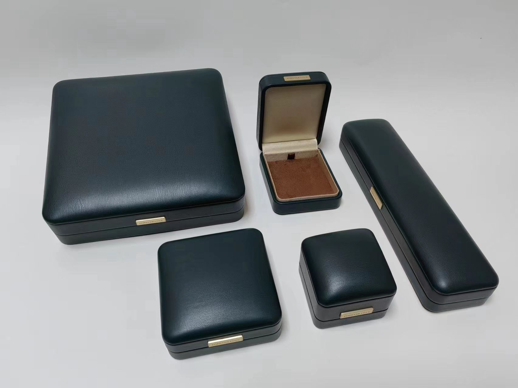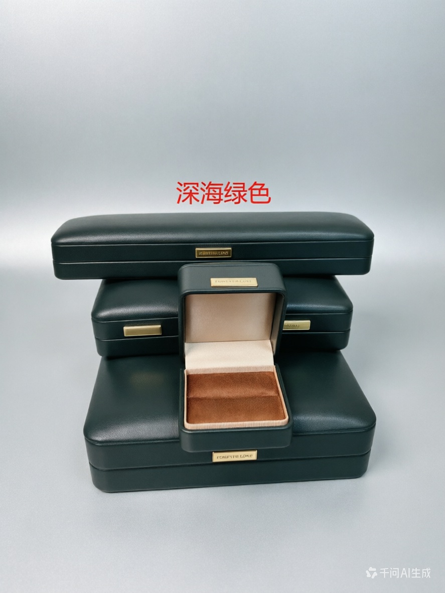 深海绿色PU皮革珠宝盒,表面细腻耐磨,内衬柔软绒布,配有“ LOVE”金属铭牌,提供多种尺寸选择,适用于戒指、手镯、项链等,兼具高级质感与实用收纳功能。