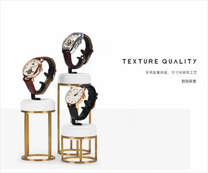 这款金属手表展示架,采用金色金属底座与黑色绒面托垫,设计简约大气。高低错落的组合,能立体呈现腕表细节,是提升陈列质感的理想之选。