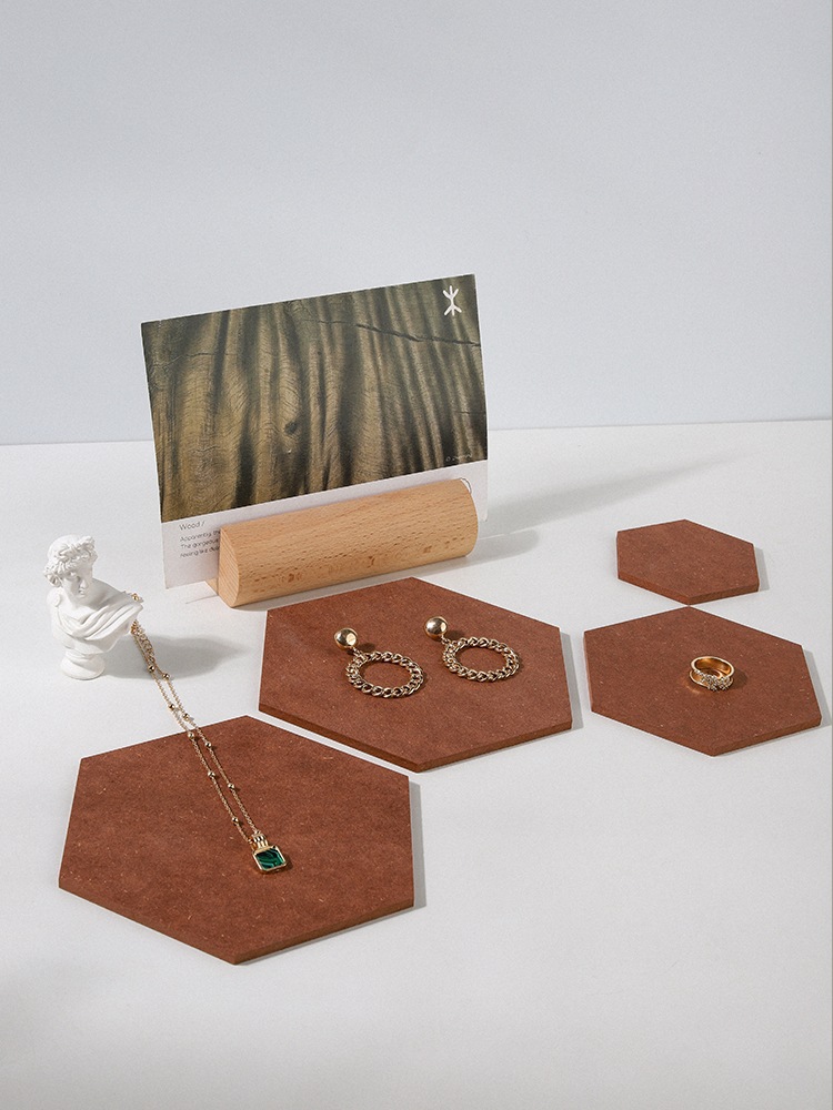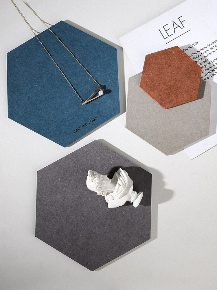 This hexagonal jewelry display board features premium velvet material, offering a soft touch that beautifully highlights jewelry brilliance. The blue version showcases a geometric necklace, while the gray one pairs with a vintage sculpture, blending functionality and artistic appeal. Customizable with LOGO, it's ideal for store displays, photography, or gift packaging, elevating product presentation.