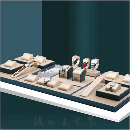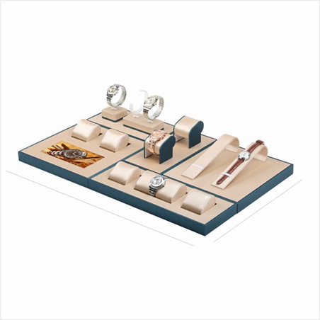 模块化组合腕表展示系统 这款模块化腕表展示系统,以蓝金撞色底座搭配米色绒面托垫,通过高低错落的立体布局,将不同尺寸、风格的腕表有序陈列。无论是商务机械表还是时尚石英表,都能在专属托位中凸显细节与质感。模块化设计支持自由组合,适配店铺橱窗、展会陈列或私人收藏,让每一枚腕表都成为视觉焦点,轻松提升品牌高端形象。 手表陈列道具 柜台内专用外拉丝皮革 高端大气 简约 提供专业设计定制,材质颜色 尺寸 陈列款式完全可按要求订制生产 OEM OEF