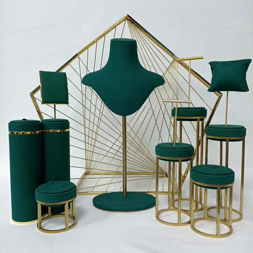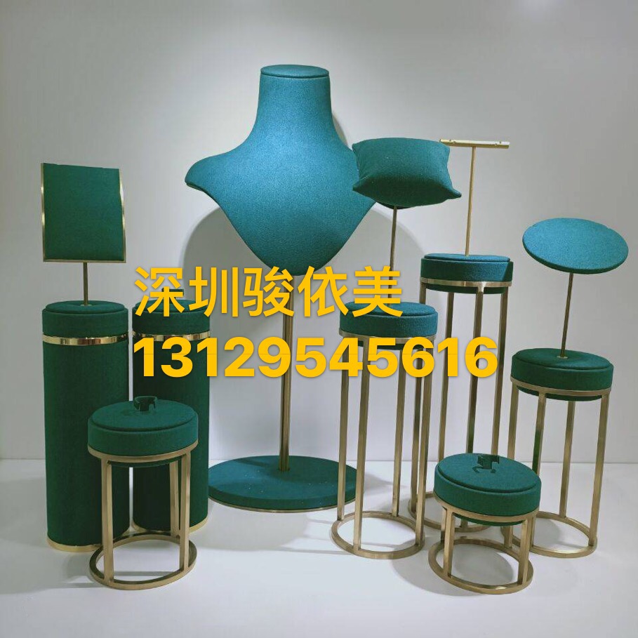 豪华珠宝展示架、墨绿绒布、金色金属架、项链人台、耳环立柱、戒指托盘、手镯圆凳、高端店铺道具、展会布景、艺术陈列