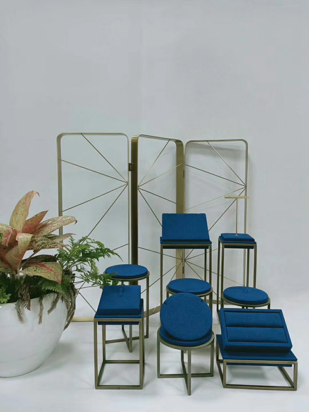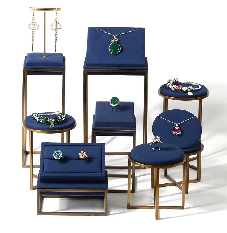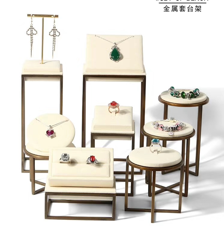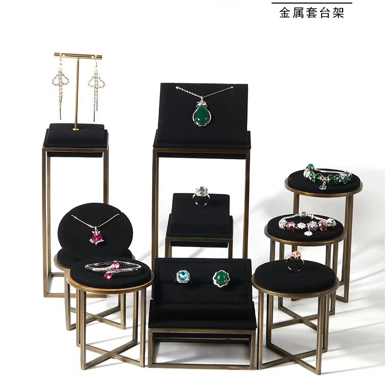 豪华珠宝展示架、墨绿绒布、金色金属架、项链人台、耳环立柱、戒指托盘、手镯圆凳、高端店铺道具、展会布景、艺术陈列