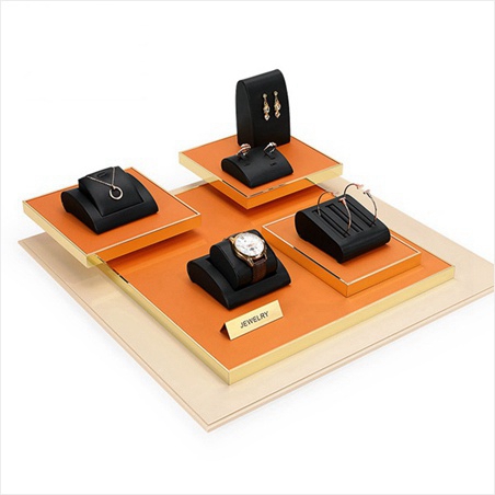 这套珠宝陈列套装采用高级黑与活力橙的撞色设计,搭配金色金属边框,尽显现代奢华格调。套装包含项链、戒指、耳环及手表等多种专业展示托,布局错落有致,能有效提升商品视觉吸引力。无论是用于精品店橱窗陈列,还是高端展会展示,都能完美衬托珠宝腕表的璀璨光芒,瞬间抓住顾客目光,提升品牌形象。