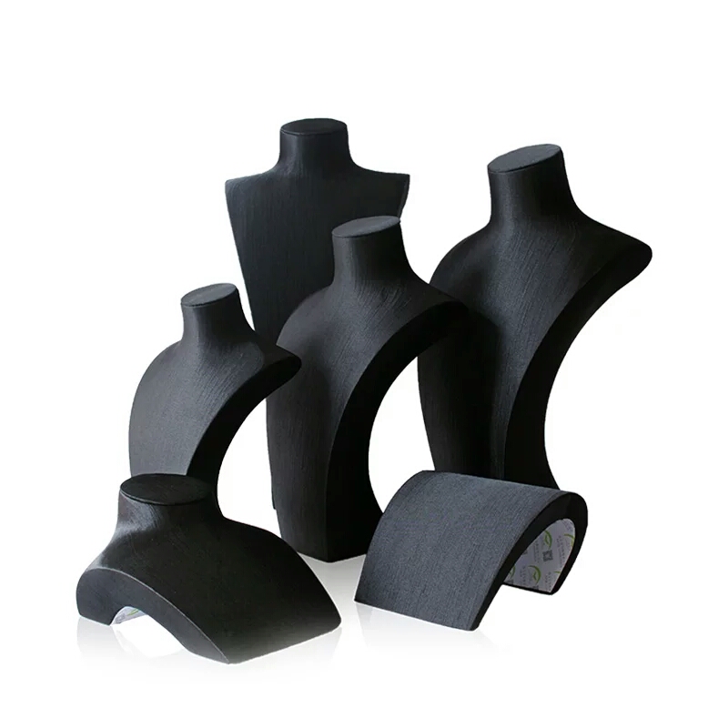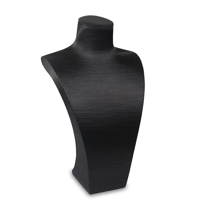 骏依美首饰包装、黑色木纹项链架、仿木纹理、人像颈模、弧形支架、全品类适配、防滑底座、珠宝店陈列、摄影布景、专业展示