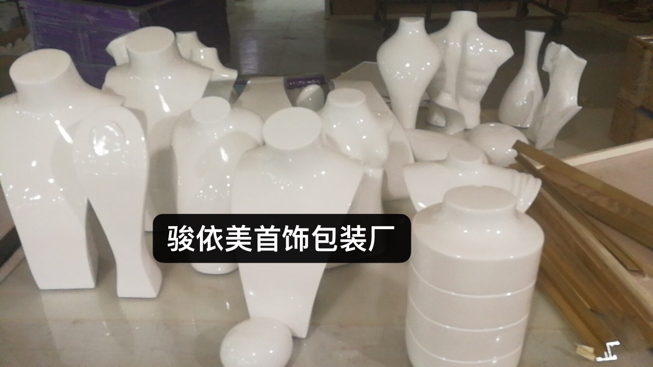 骏依美首饰包装、白色高光颈模、流线型设计、锁骨链展示、吊坠陈列、防滑底座、珠宝店道具、商业摄影、高端质感