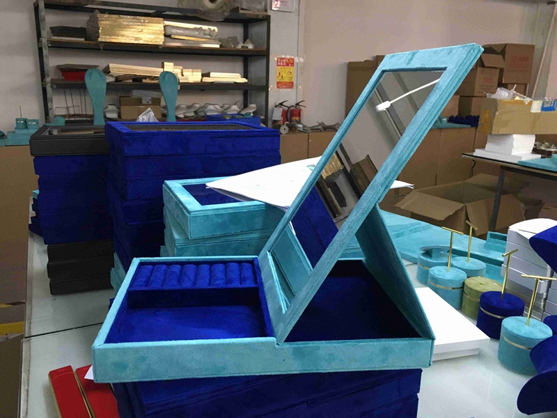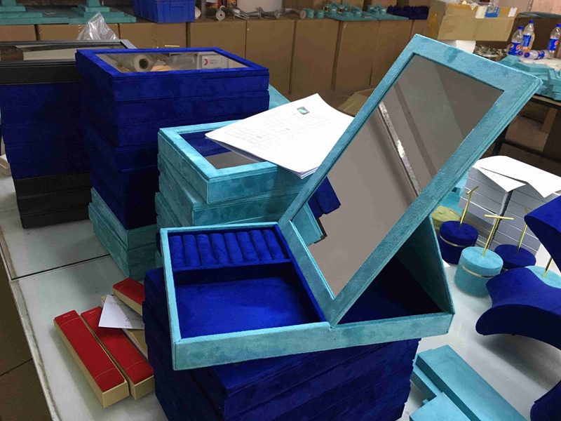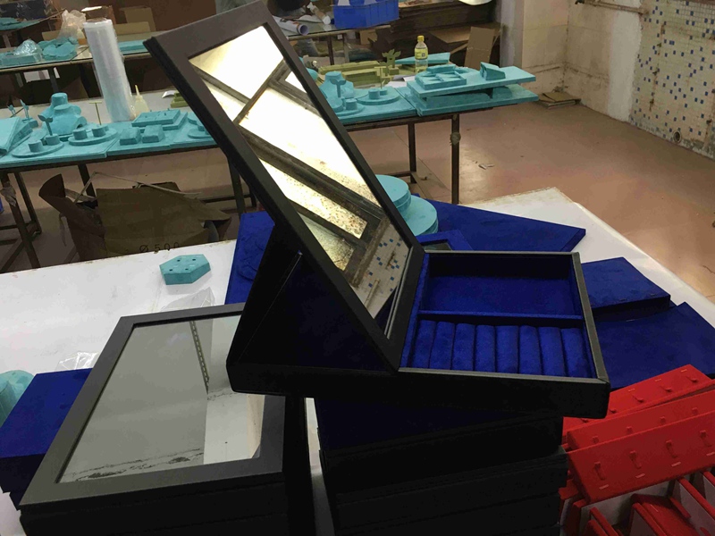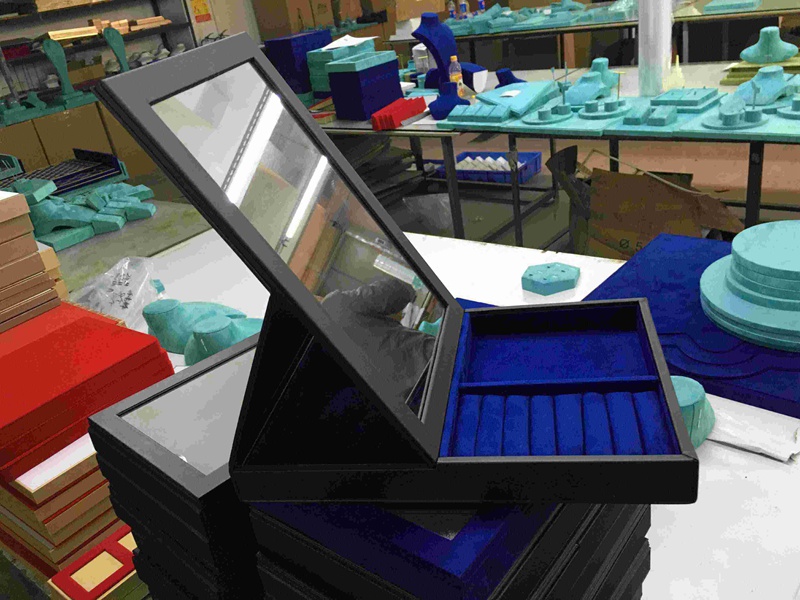 骏依美首饰包装、黑色木质首饰盒、宝蓝色丝绒内衬、透明玻璃盖、内置镜、多格分区、珠宝店陈列、个人收藏、防尘收纳、优雅格调