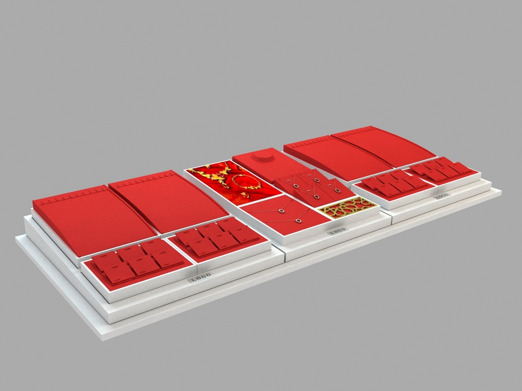 This red and white jewelry display set is designed for high-end accessories like necklaces, rings, and earrings, featuring a modular design and customizable logo space. The red velvet surface paired with a white base exudes elegance and sophistication, perfect for boutiques, exhibitions, and live streaming, enhancing product prestige and visual appeal.